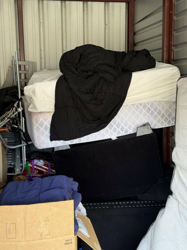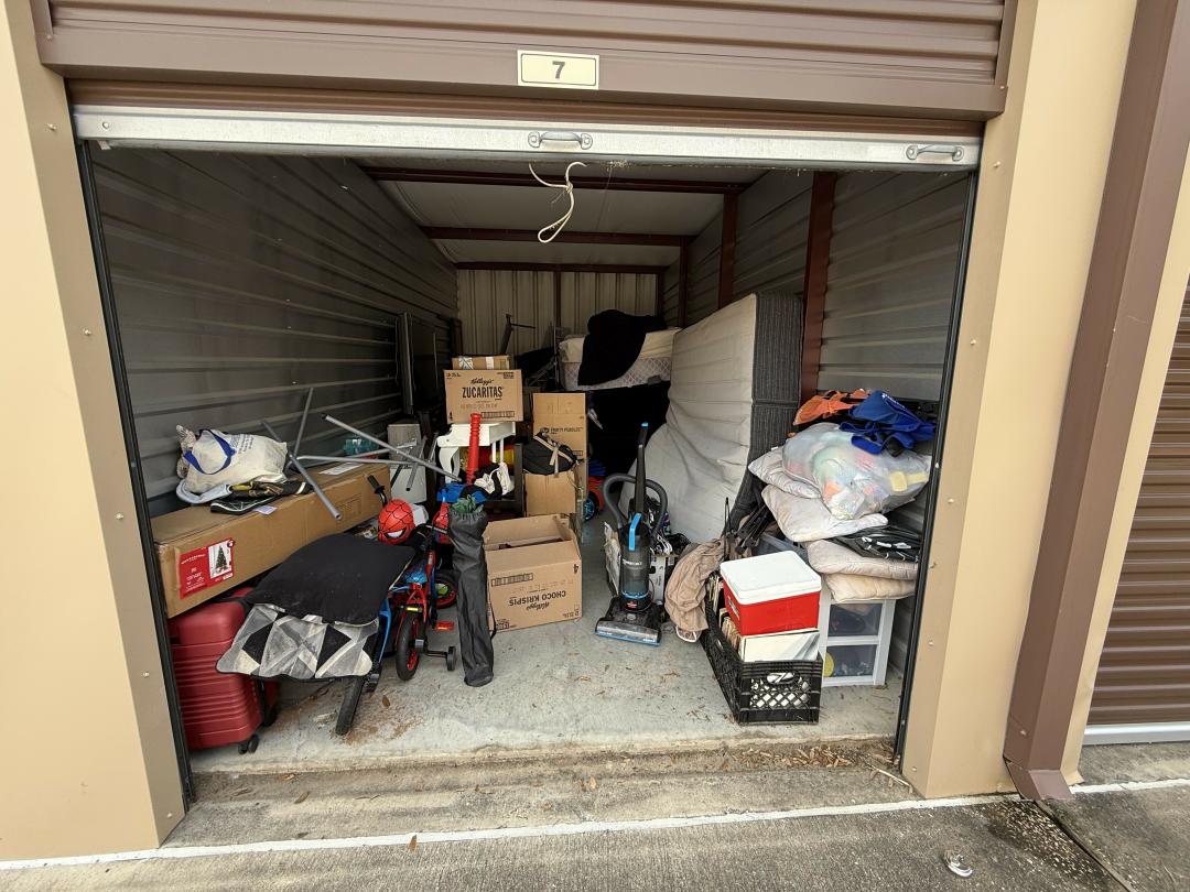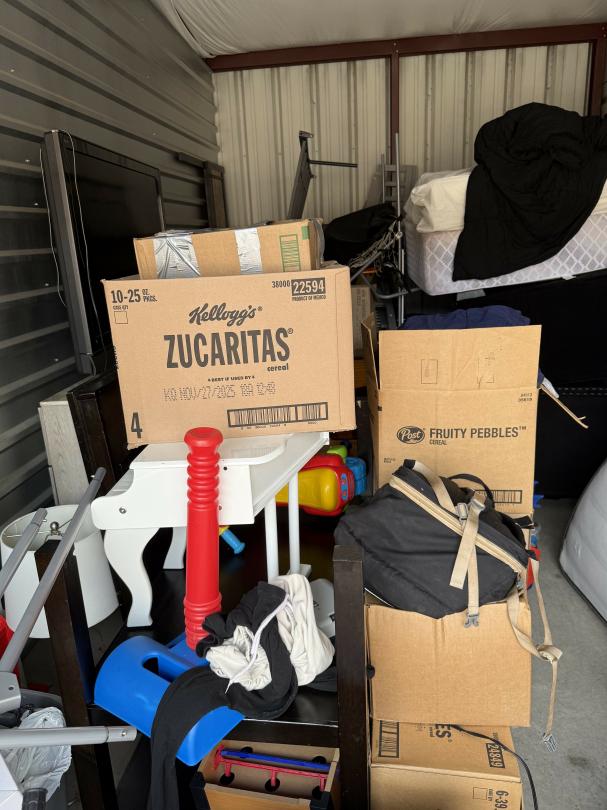 This unit appears to contain…bed, books, boxes, chairs, children's bike, chirldren's ride on toys, cloths, coffee table, couch, dresser, flat screen tv, toys, vacuum