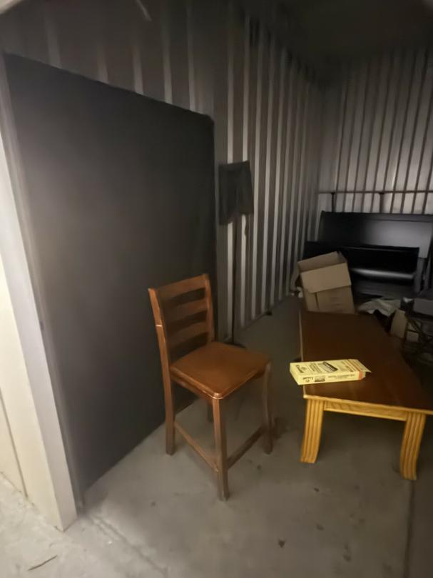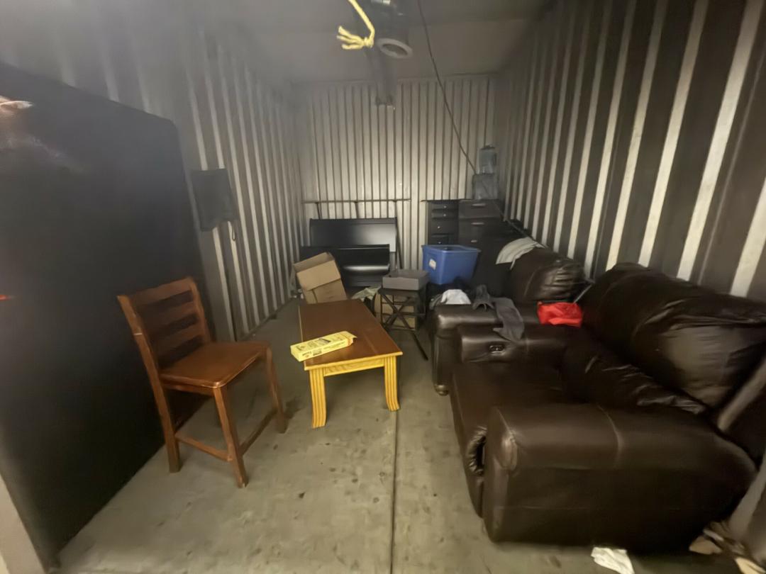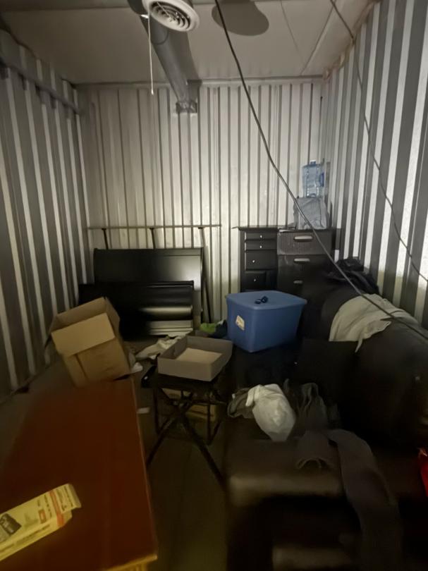 This unit appears to contain…Couches, shelving, box springs, bed frames, dressers, chairs, plastic bags, plastic containers, boxes, and clothing.