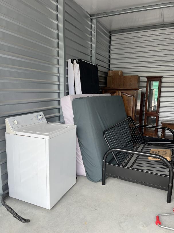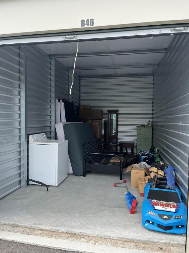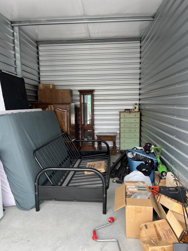 This unit appears to contain…This unit may contain curio cabinet, dressers, bed frames, mattress, box spring, futon, fishing poles, tools, boxes, totes, end table, battery operated toy car.