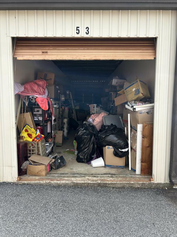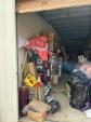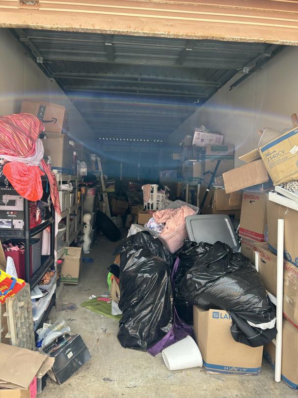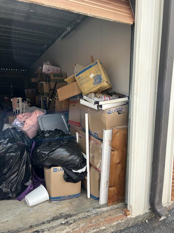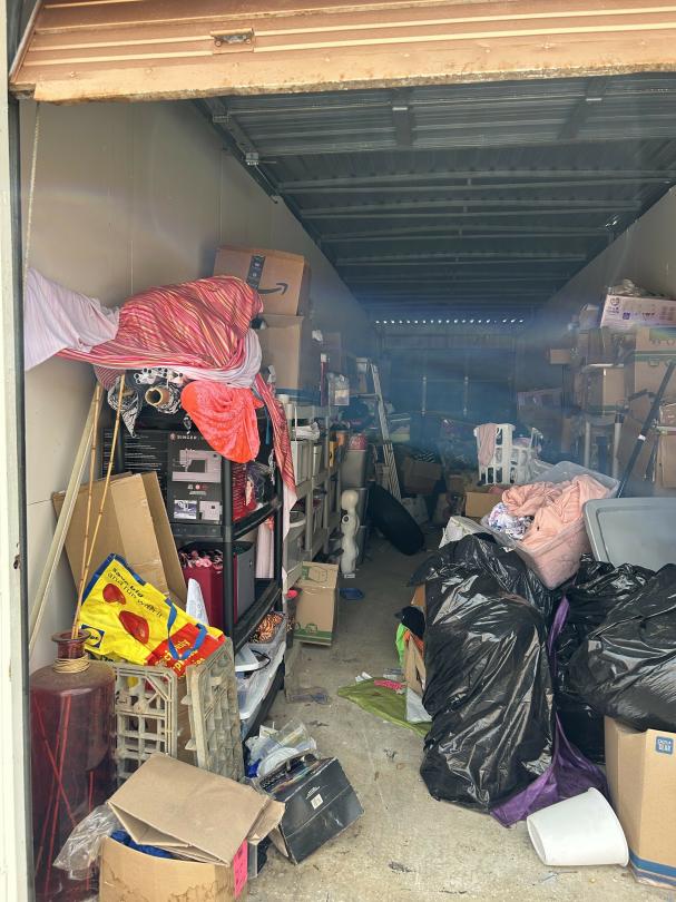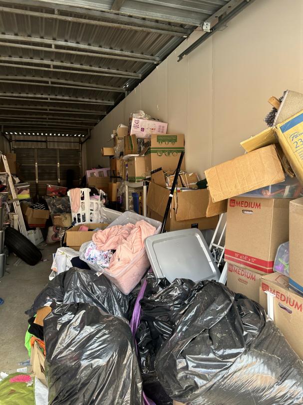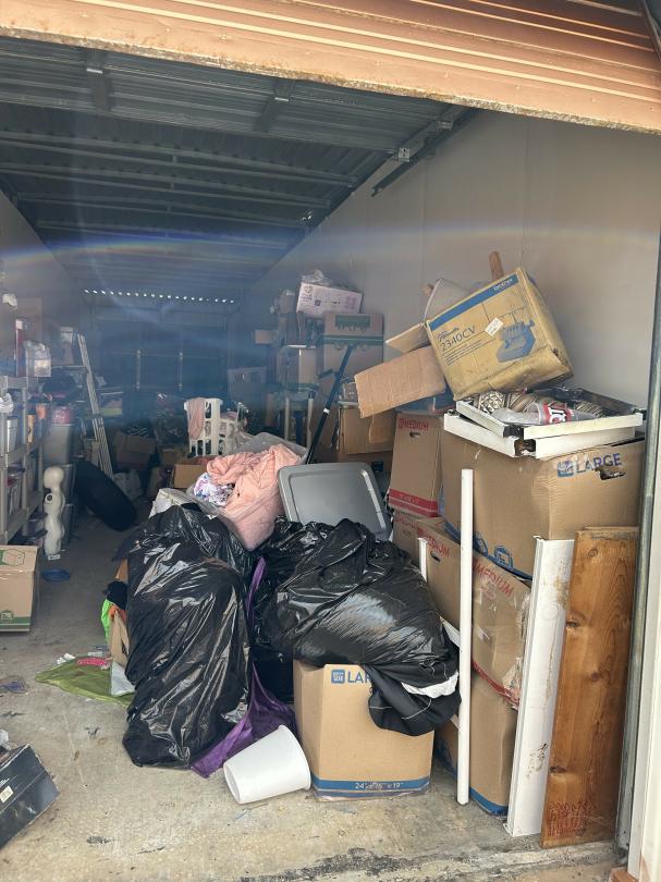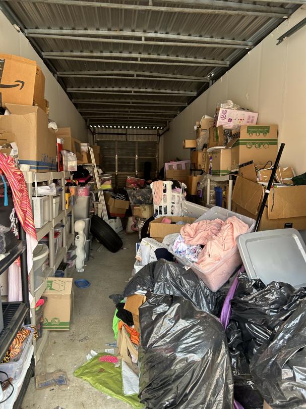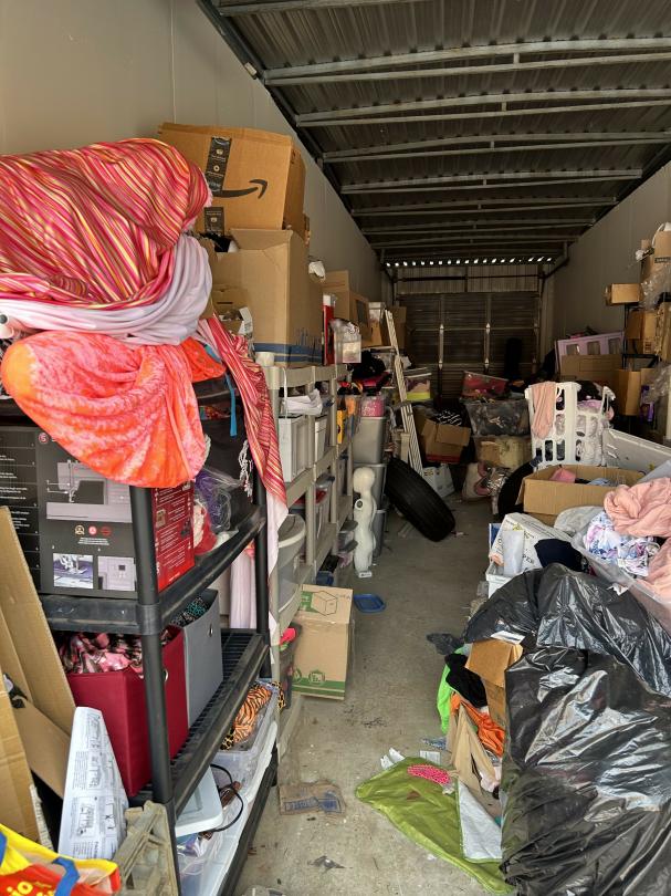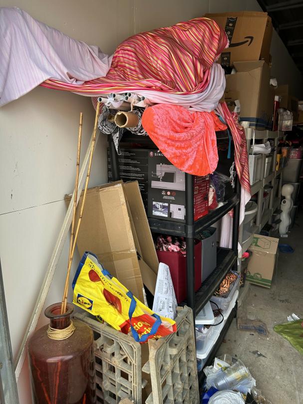 This unit appears to contain…Boxes, bags, shelving, fabric, totes, tire, basket, storage containers, sewing items, misc items,