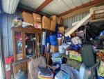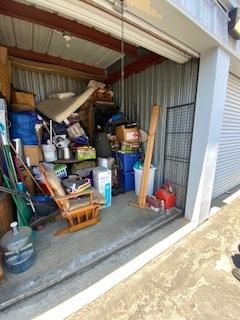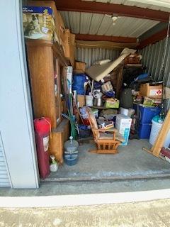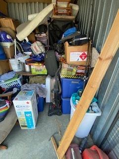 This unit appears to contain…Wood furniture, bins, totes, chair, boxes, suitcase, vacuum, cleaning equipment, fishing poles/equipment,