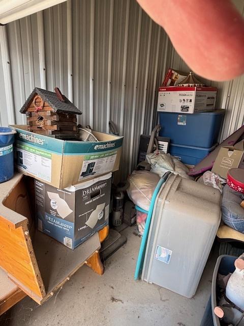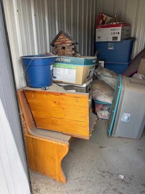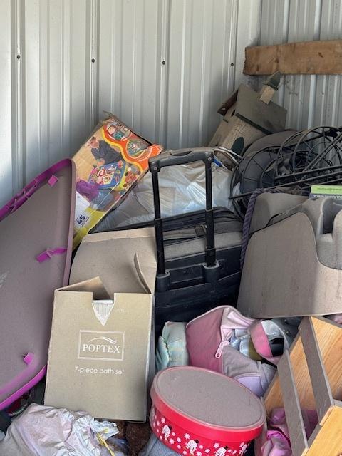 This unit appears to contain…Boxes, totes, bench, keyboard, vacuum, luggage, decor, bird houses, etc.