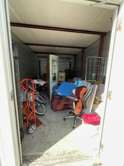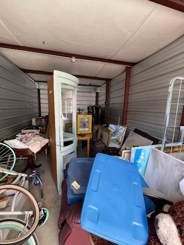 This unit appears to contain…ping pong table, curio cabinet, bikes, tables, small drink fridge, dolly, pictures, totes, boxes, misc items