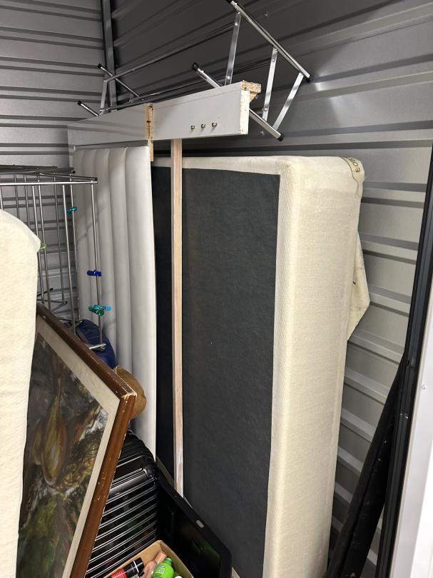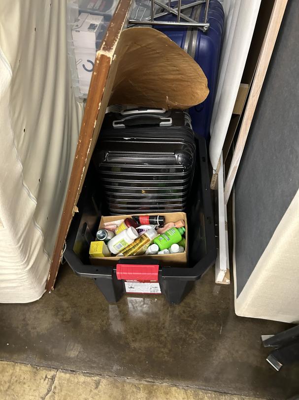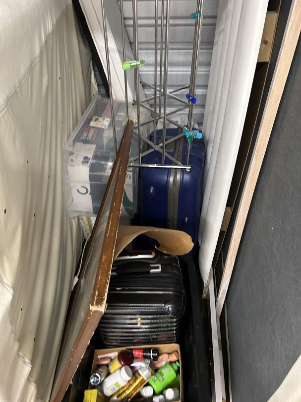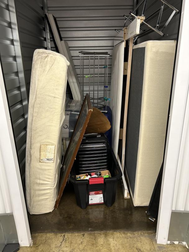 This unit appears to contain…READ ALL AUCTION RULES BEFORE BIDDING!!! Unit appears to contain: shoe racks, suitcases, bed frame, mattress, shoe boxes