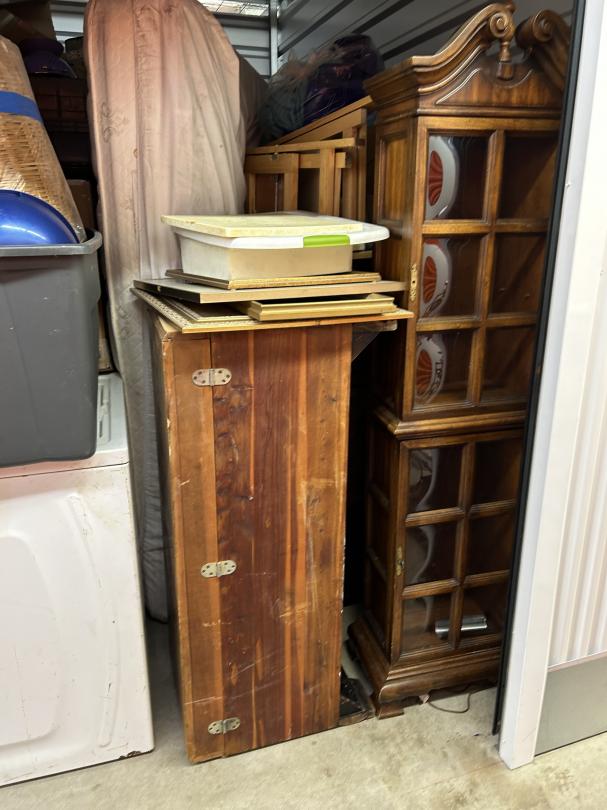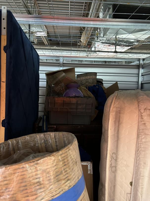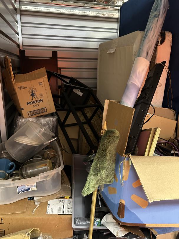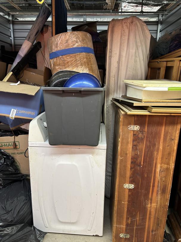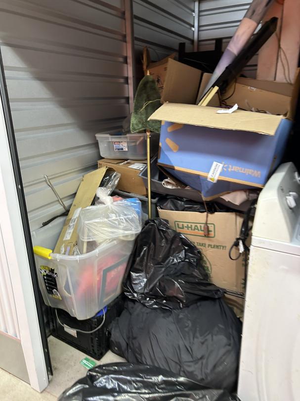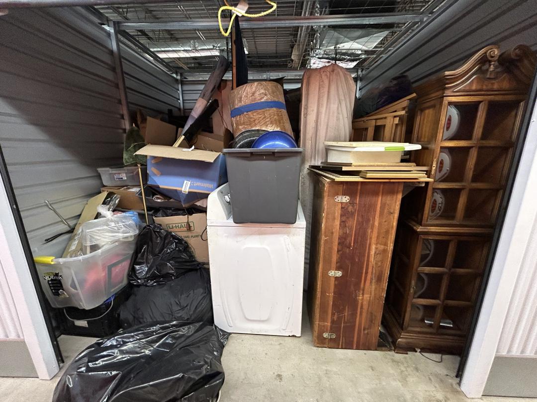 This unit appears to contain…READ ALL AUCTION RULES BEFORE BIDDING!!! Unit appears to contain: bags, totes, washer, chest, curio cabinet, folding tables, boxes, mattress, box spring, mason jars, pictures, rug
