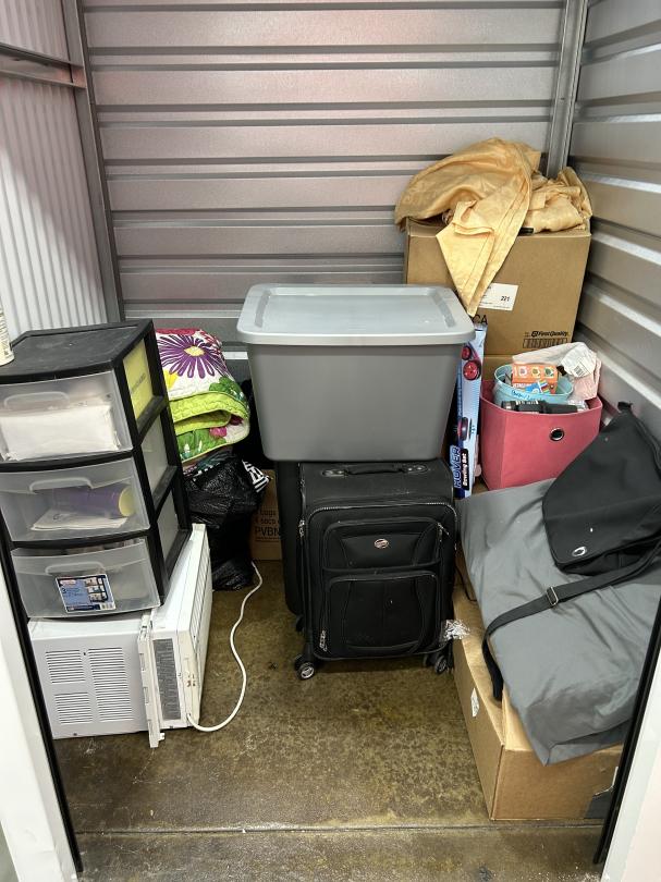 This unit appears to contain…READ ALL AUCTION RULES BEFORE BIDDING!!! Unit appears to contain: suitcase, A/C, totes, boxes, pillow