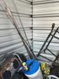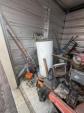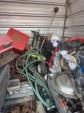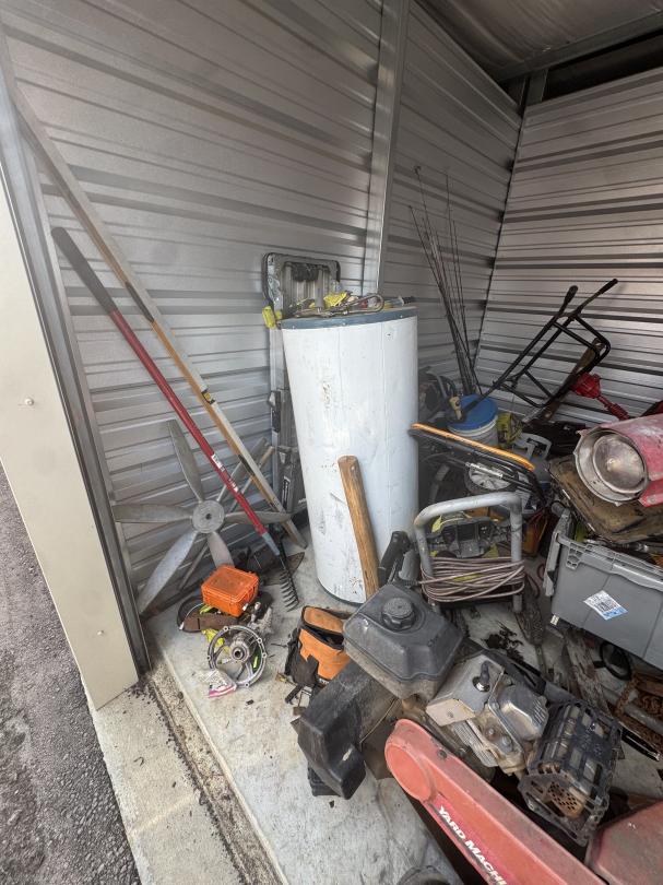 This unit appears to contain…Unit appears to have Red Yard Machine rear tine tiller, power tools, Ryobi drill, Ridgid tool bags, circular saws, portable heaters, large red utility spotlight, toolboxes, hand tools, used water heater, Ryobi gas-powered pressure washer, ladders, fishing rods, gas cans, lawn and garden tools, shop vac, extension cords, hoses, propane tanks, mechanical parts, auto accessories.