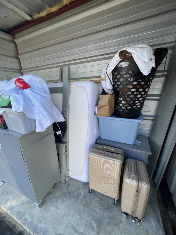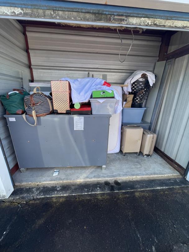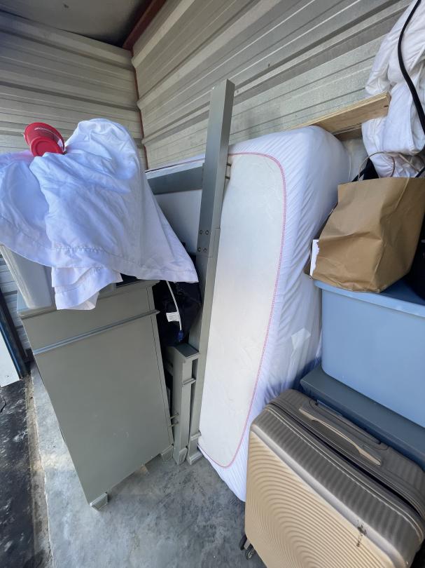 This unit appears to contain…Full size mattress and box spring, headboard and footboard, dresser, night stand, set of two luggage, laundry basket, MK overnight bag, travel make-up case, iron, Ladies sandals, misc totes and bags.