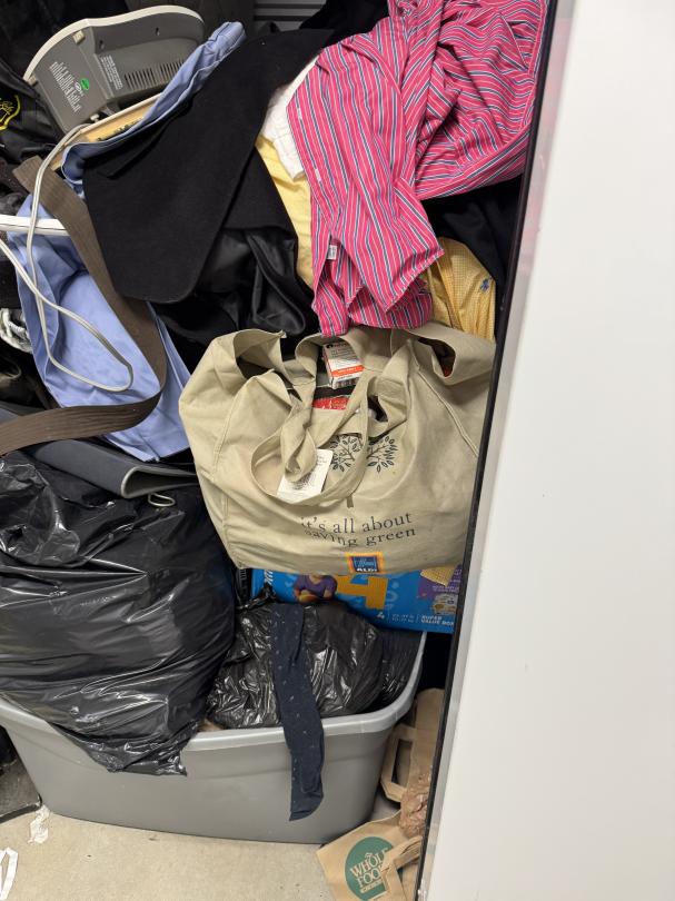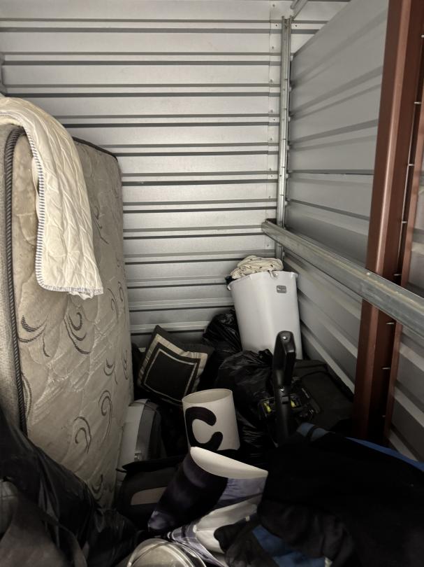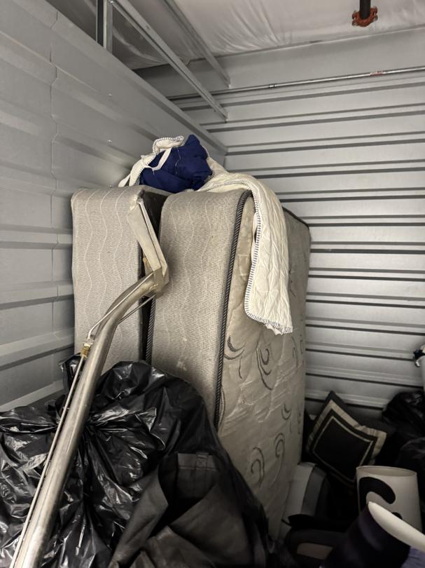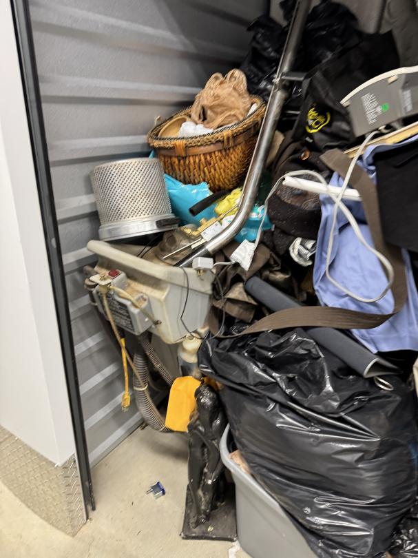 This unit appears to contain…golf clubs, carpet cleaner, bags, mattress, totes