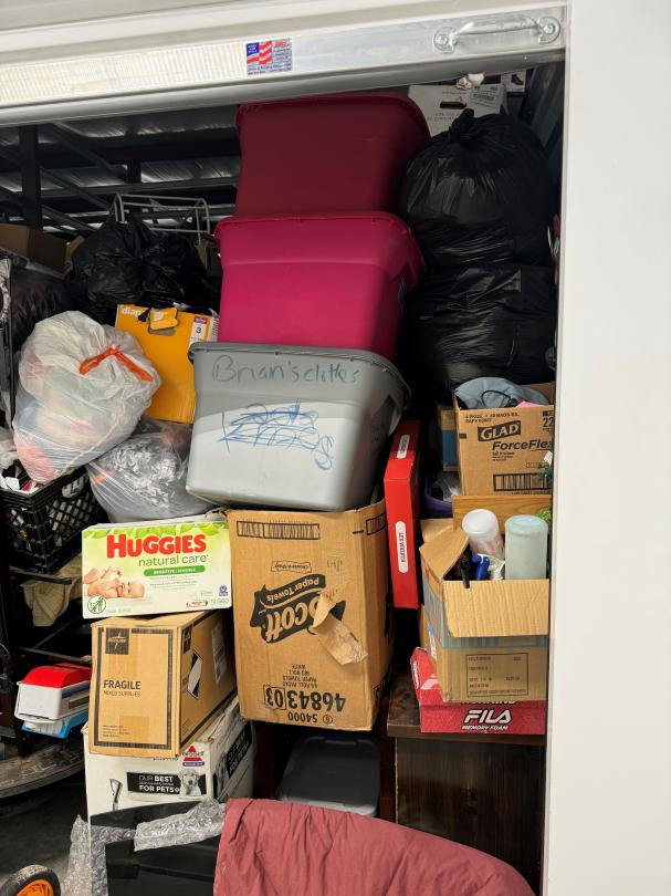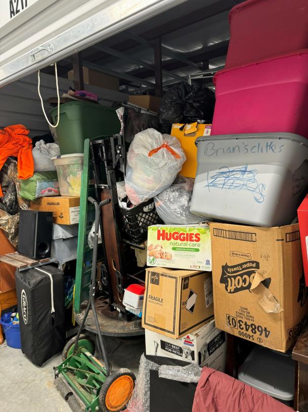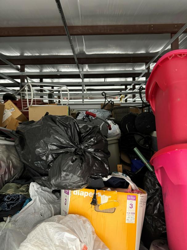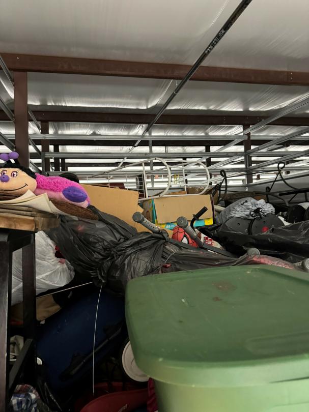 This unit appears to contain…BOXES, TOTES, FIRE PIT, TABLE, OLD PUSH MOWER NON ELECTRIC, OUTDOOR FURNITURE AND ETC