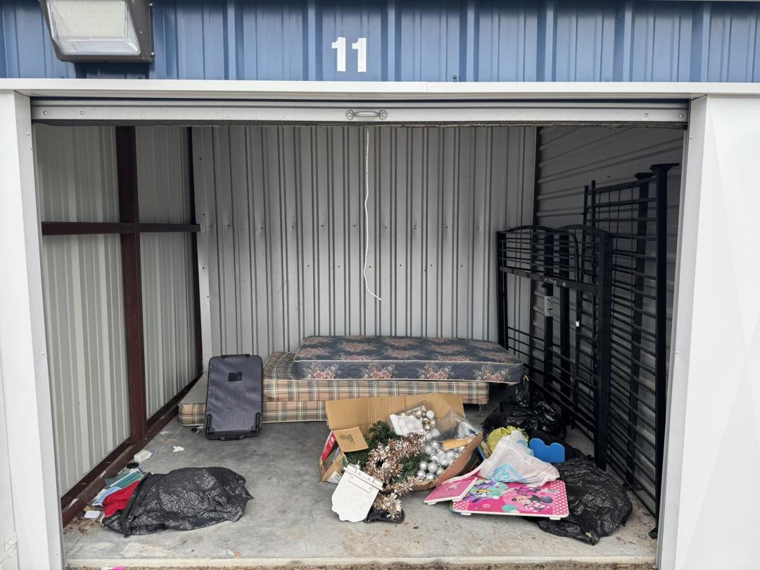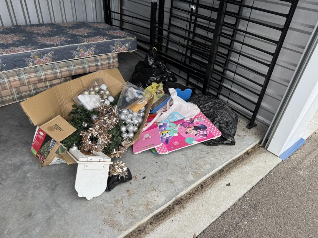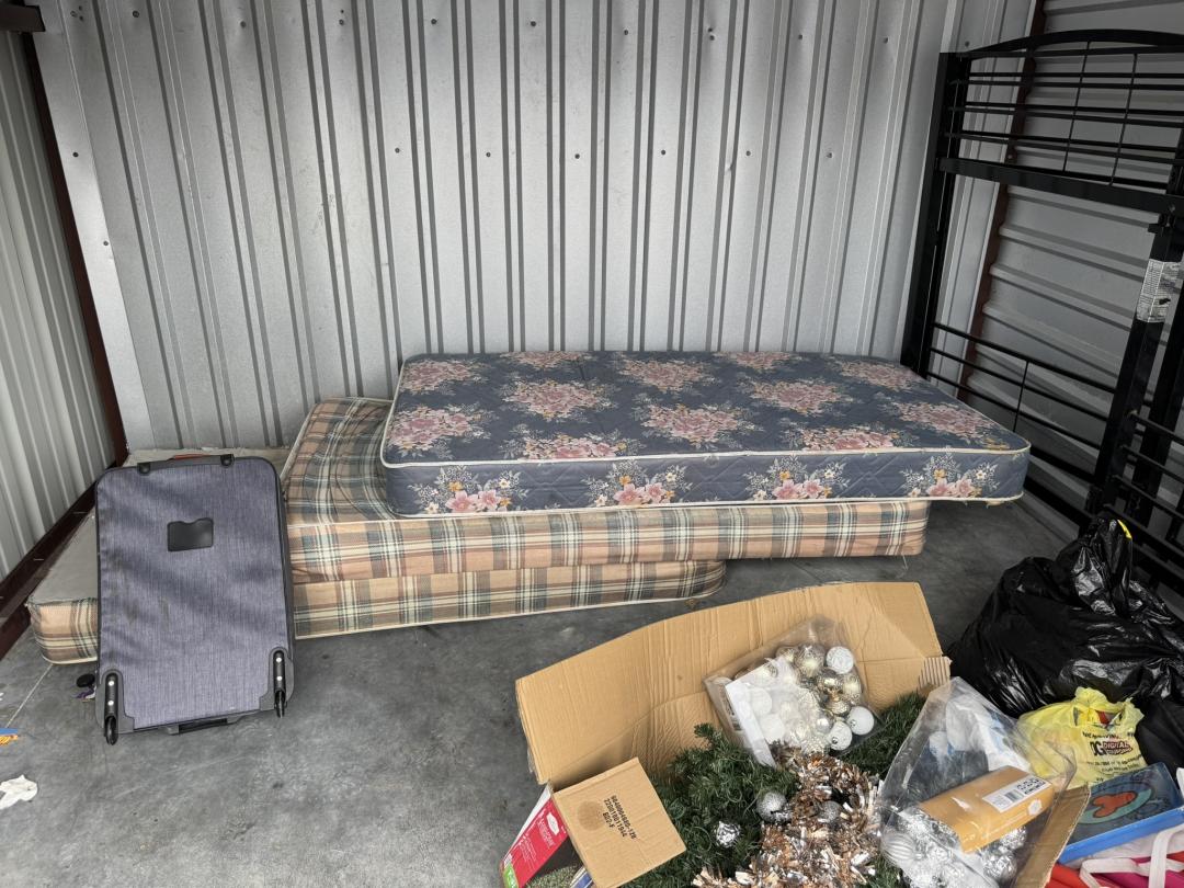 This unit appears to contain…Metal bunk beds with mattress, Christmas items, Bags, Suitcase
