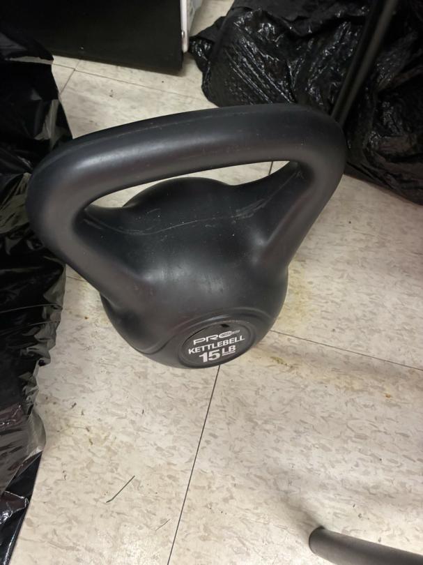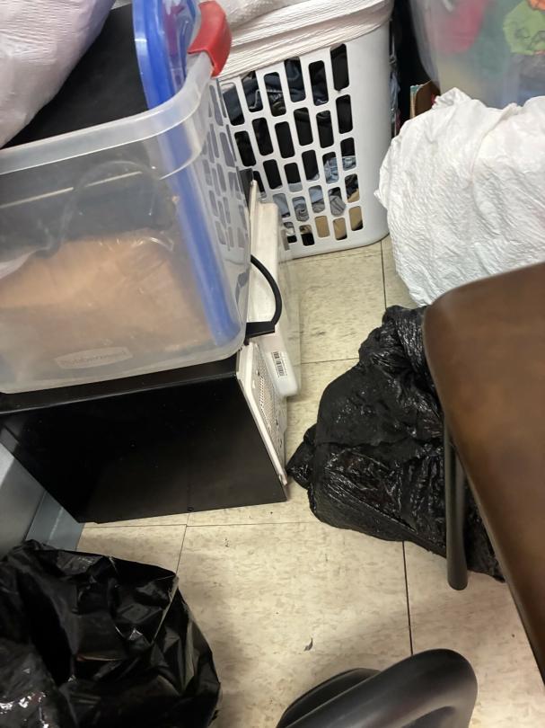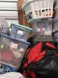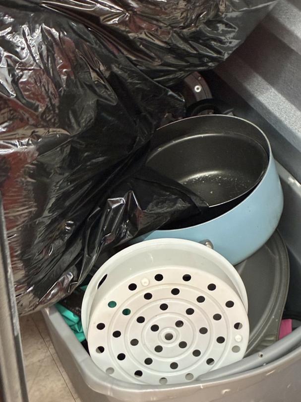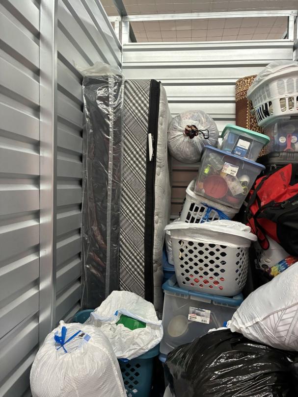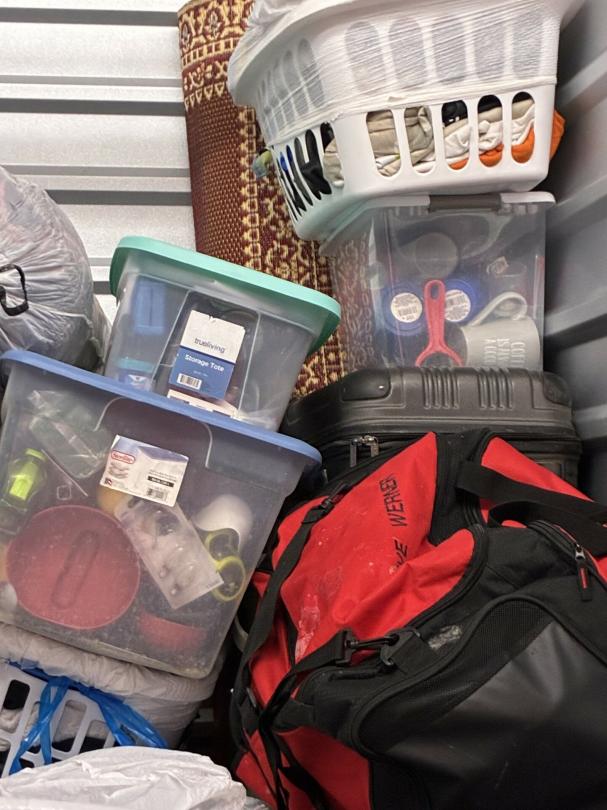This unit appears to contain…Chair, Bed, kitchenware, microwave, rug, DVD player, weight bags & totes of misc. items