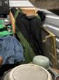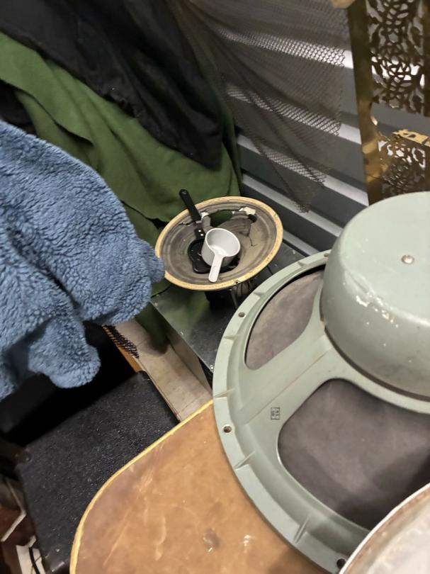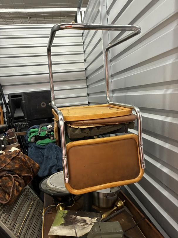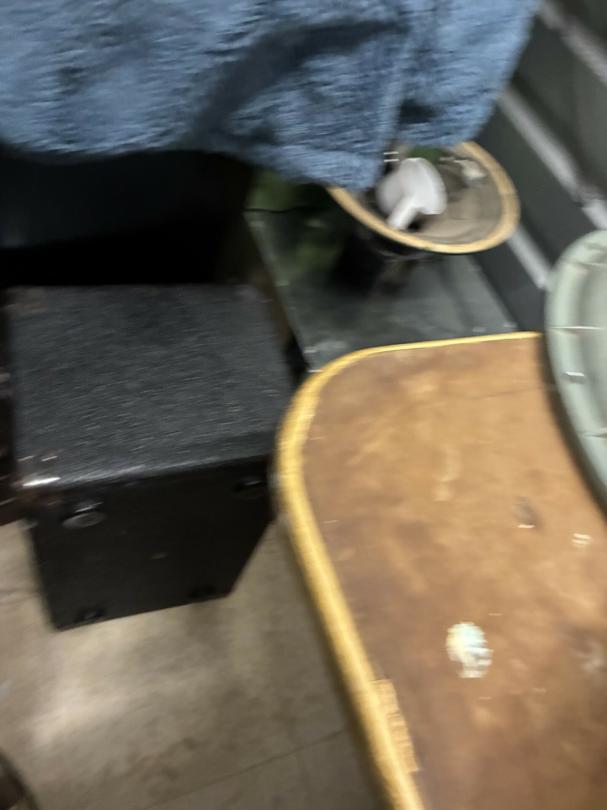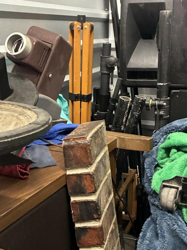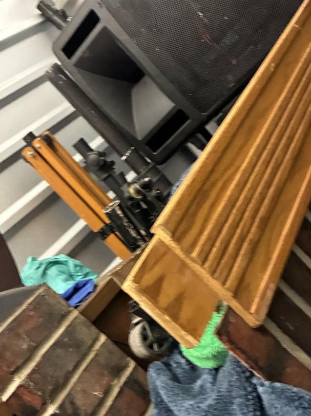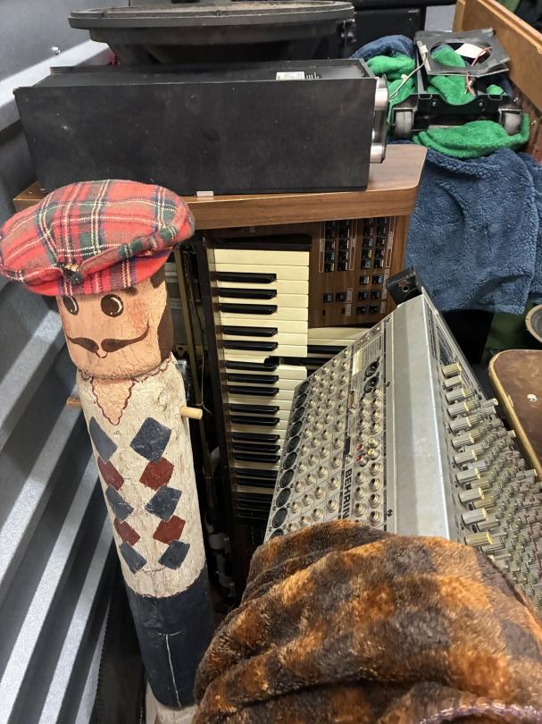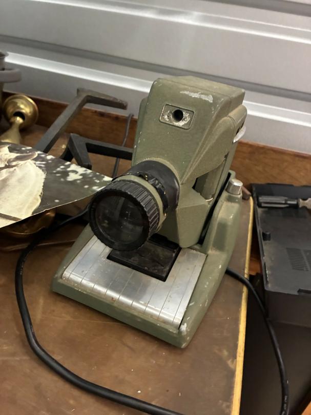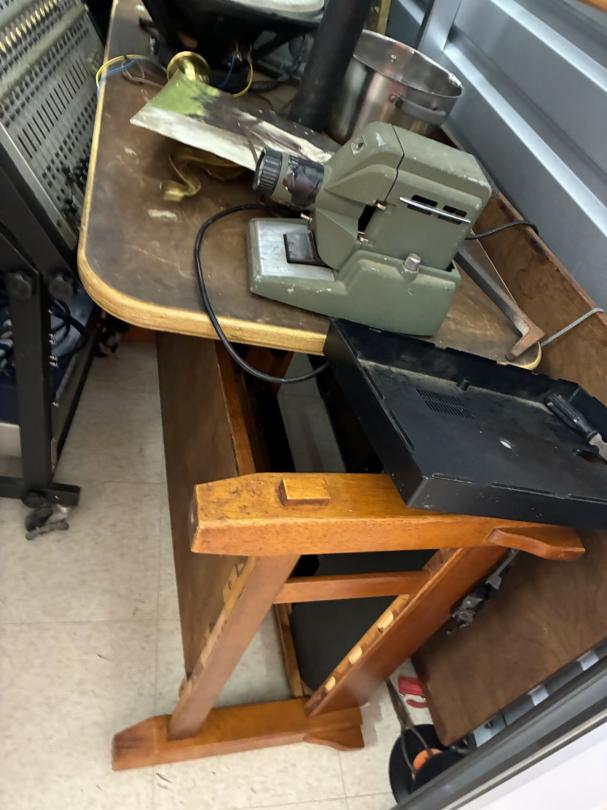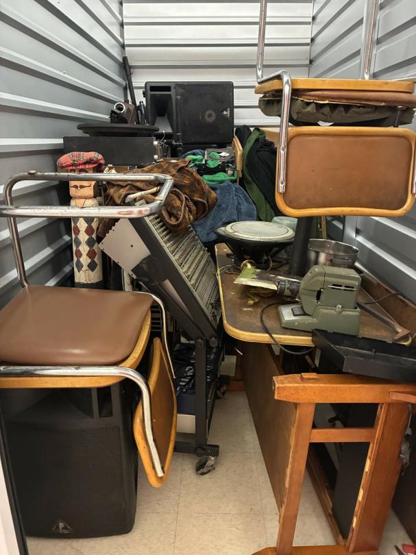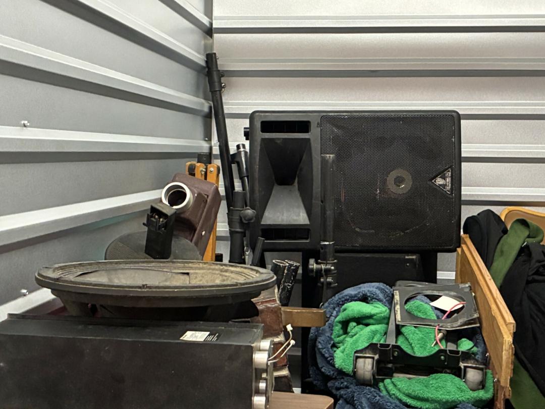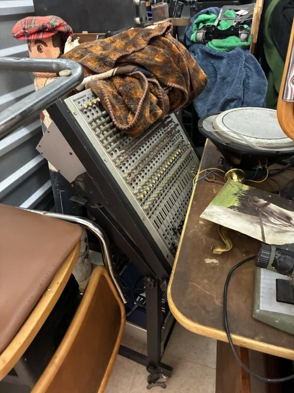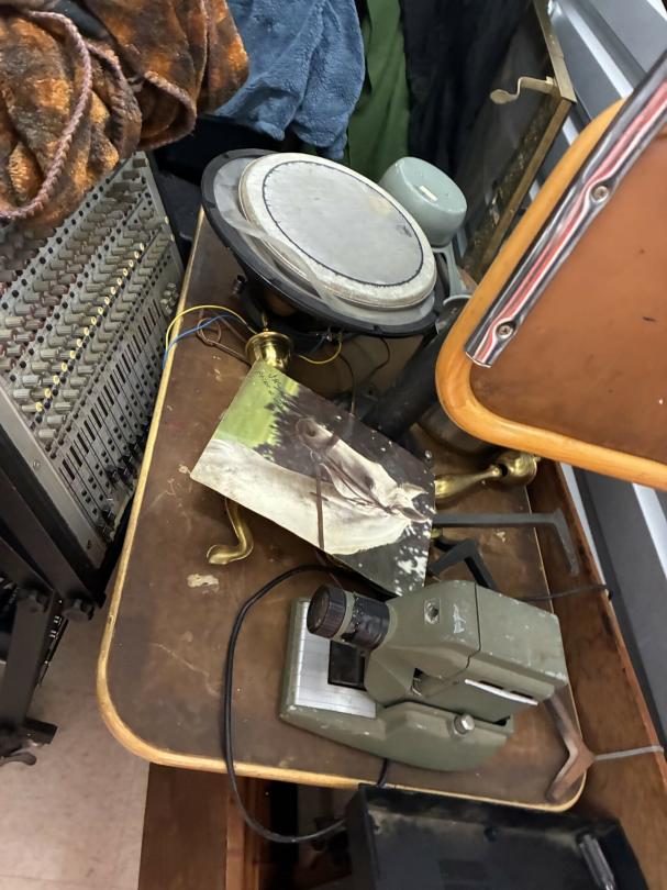 This unit appears to contain…Scan slide projector, multiple speakers, mixing consol w/component, Pearl Keyboard, misc. projector, table & chairs, fireplace frame