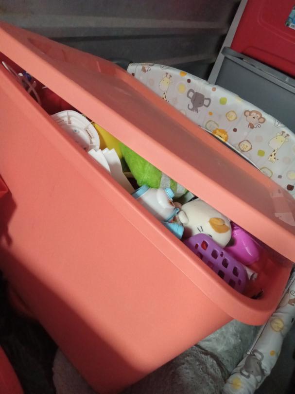 This unit appears to contain…Baby Pack and Play/Crib, Totes, Basket, Kitchenware, TV stand, Shoes, Toys, Cooler, Jigsw