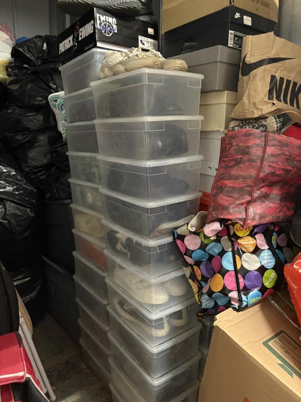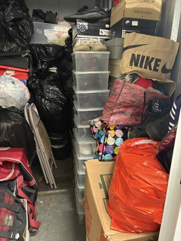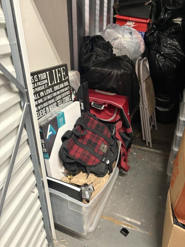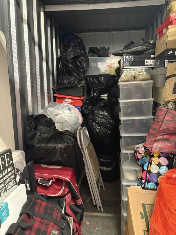This unit appears to contain…unit appears to contain shoes, boxes, bags, chairs, luggage, bins, dart board, canvas seal 4175495