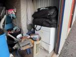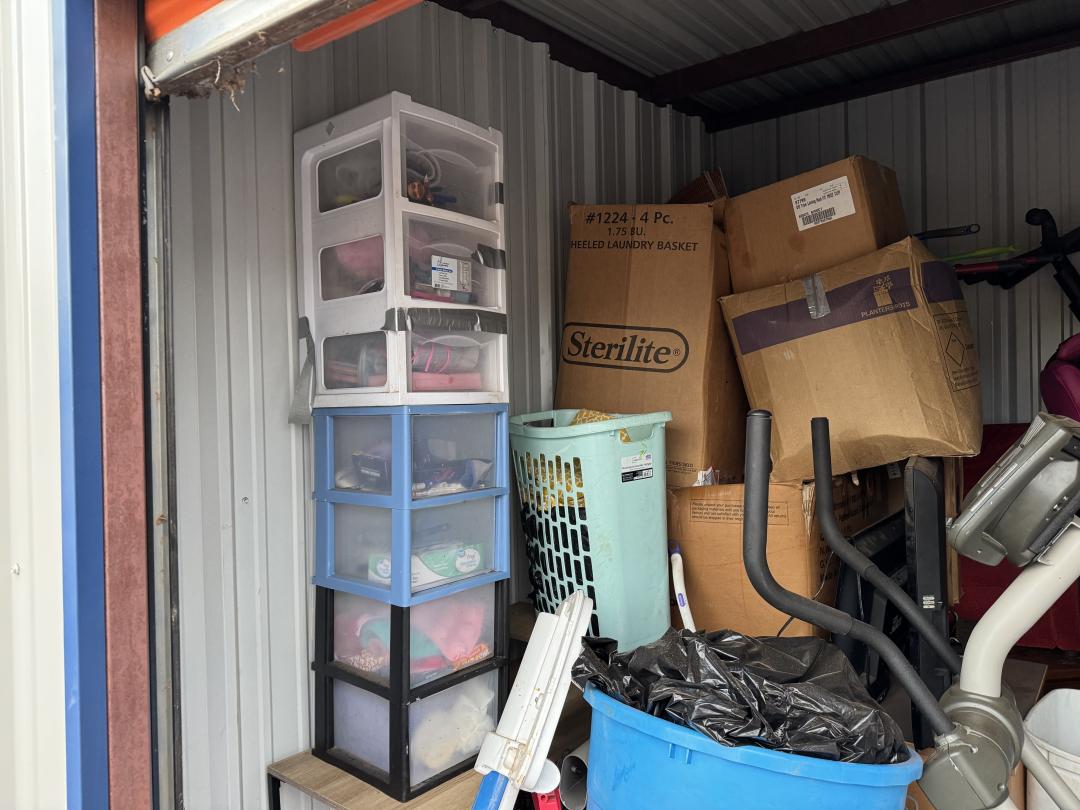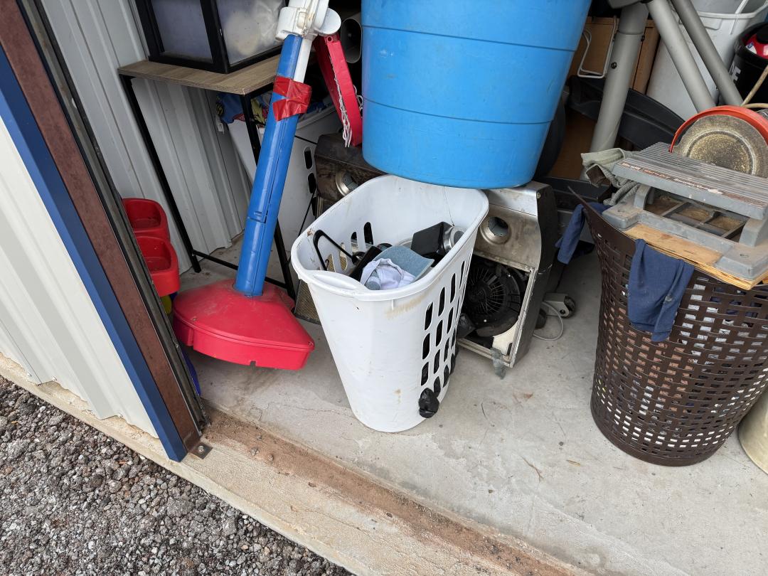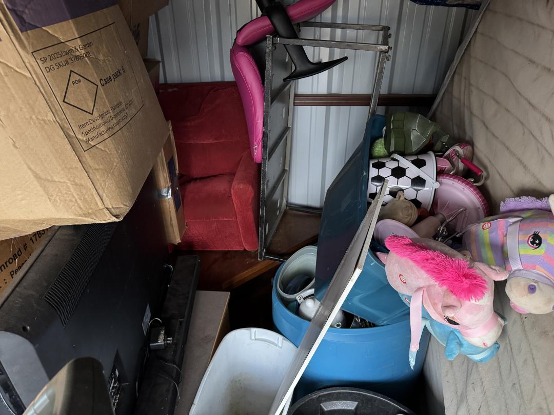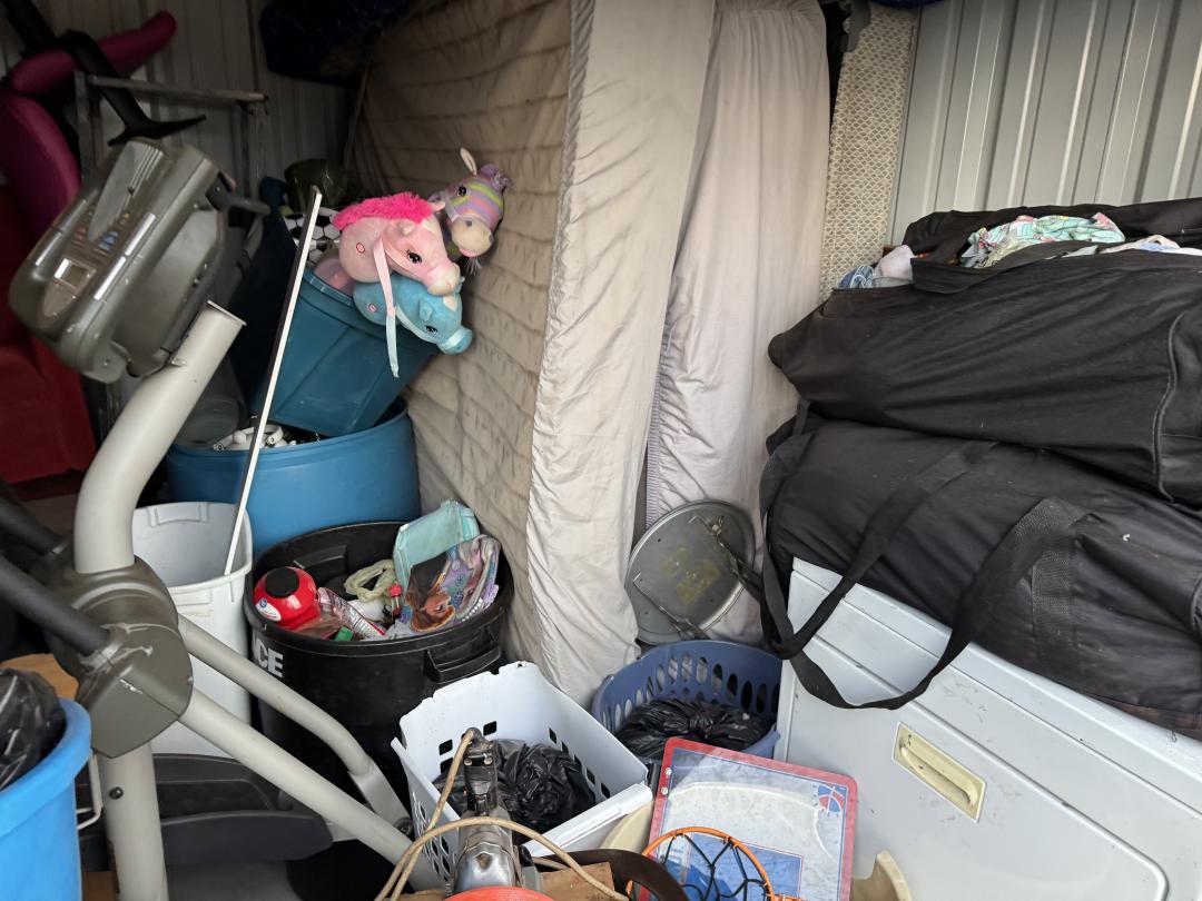 This unit appears to contain…Dryer, bed, chair, toys, bags, tv, and misc.