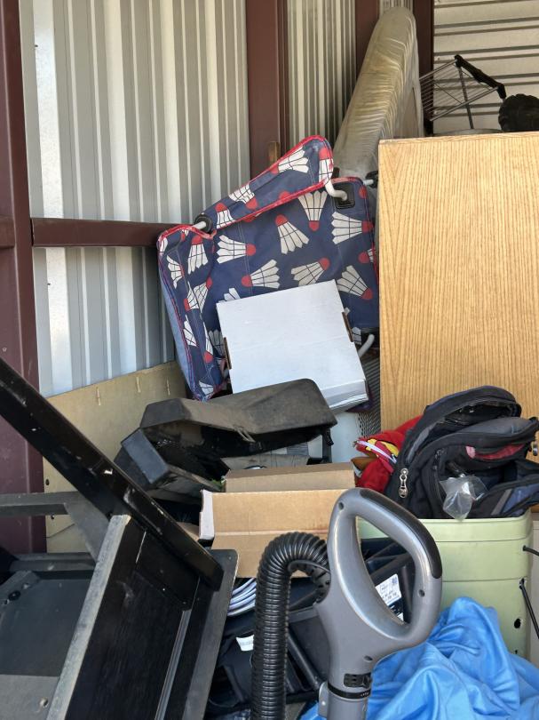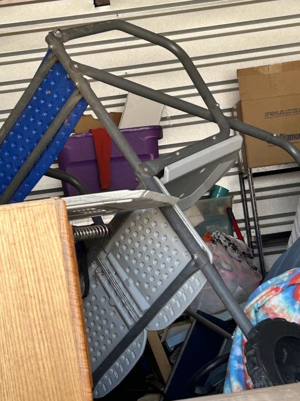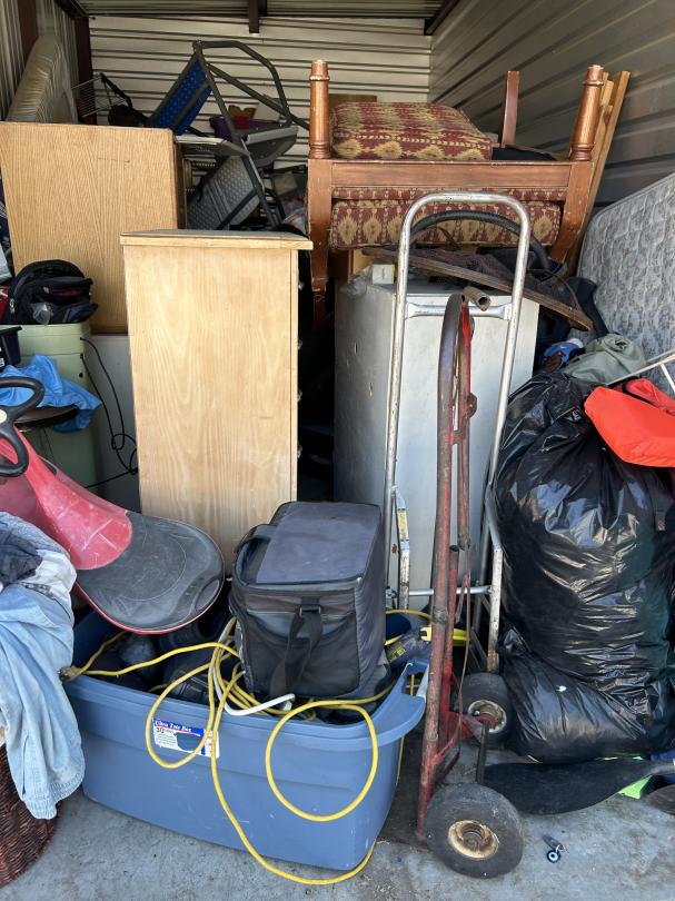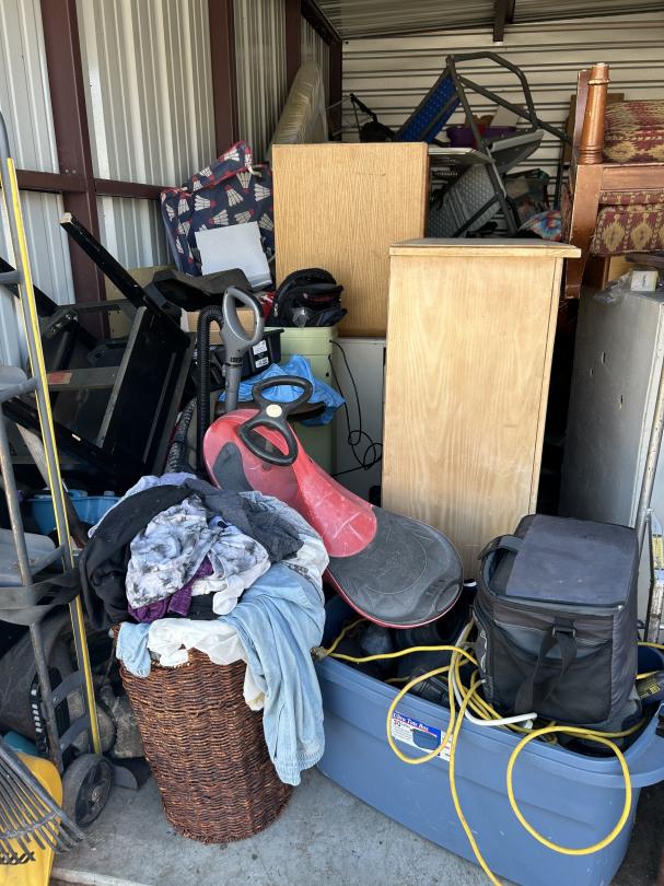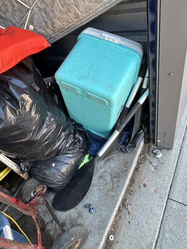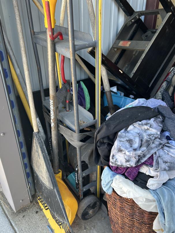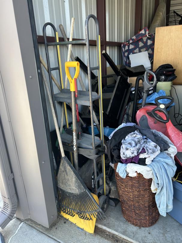 This unit appears to contain…Backpack, Bag, Bin, Boxes, Chairs, Cooler, Furniture, Shelves, Dog cage, Tools, Toys, Yard tools, Dollies, Extension cords, Saw, Kayak/Oars, Yard toys.