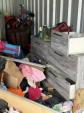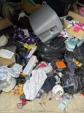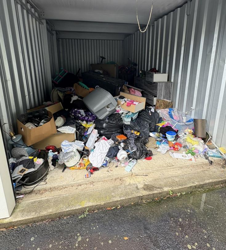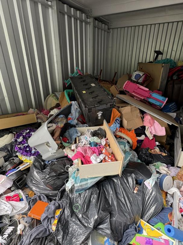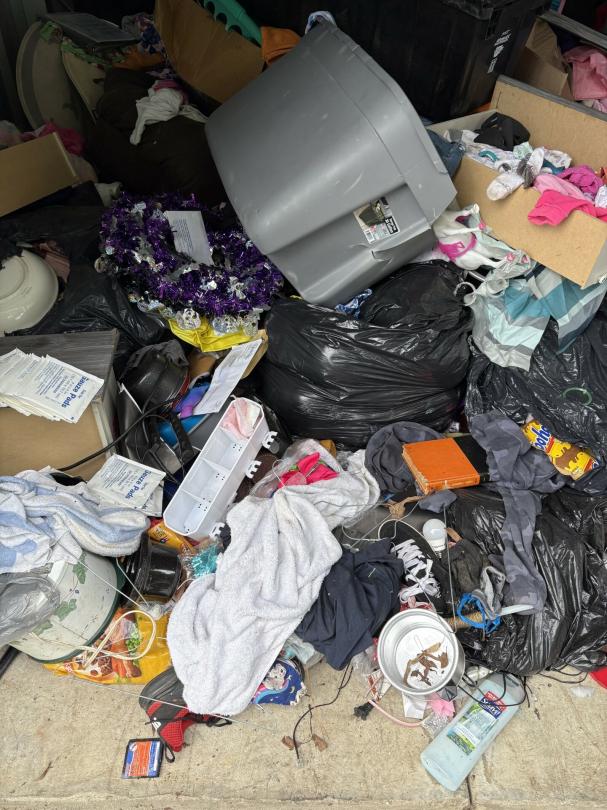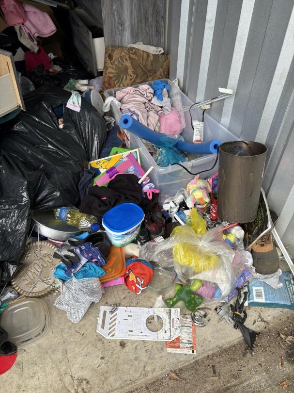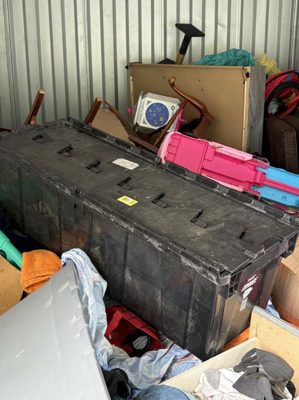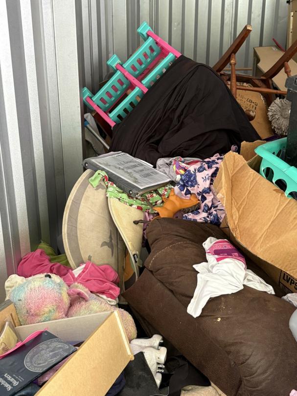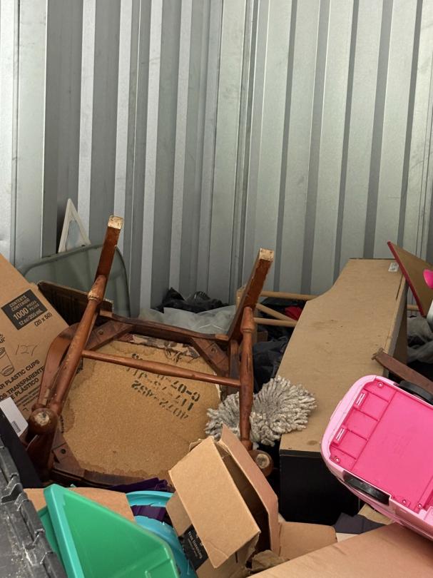 This unit appears to contain…Computer Equipment, Printers, Mattress, Box Spring, Dresser, Lamps, Chairs, Table, Decor, Plastic Bags, Plastic Containers, Misc. Boxes, Clothing, Laundry Basket, Cleaning Supplies, Vacuums, Brooms, Fishing Poles, Folding Table, Misc. Items