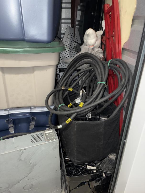 This unit appears to contain…server unit and 2 towers w/doors 30 plus phones, Cables, plug in chargers, a lot of electronics, air compressor, chairs, Christmas tree, and decorations