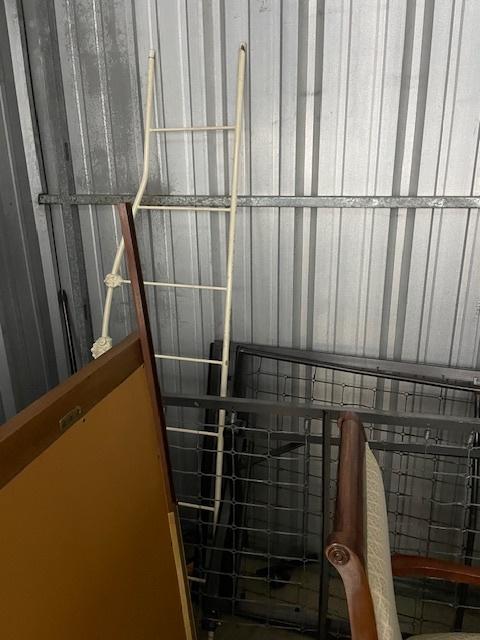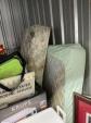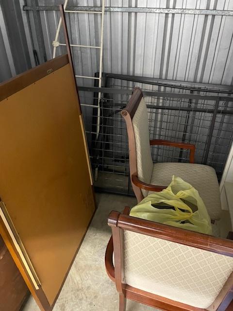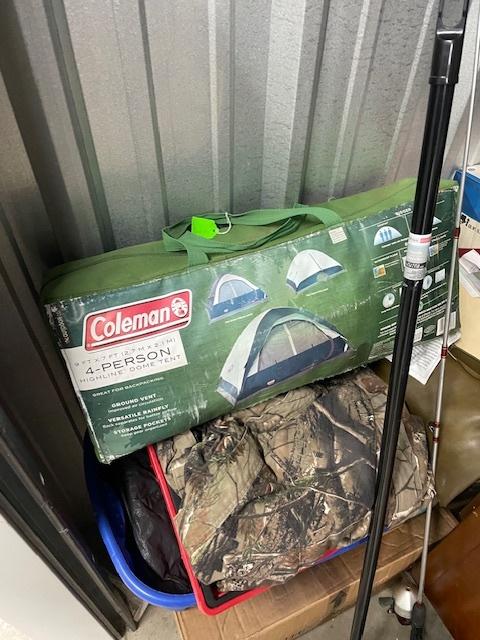 This unit appears to contain…4 person Coleman tent, dining room chairs, bed frame, mattress and box spring, framed picture and boxes.