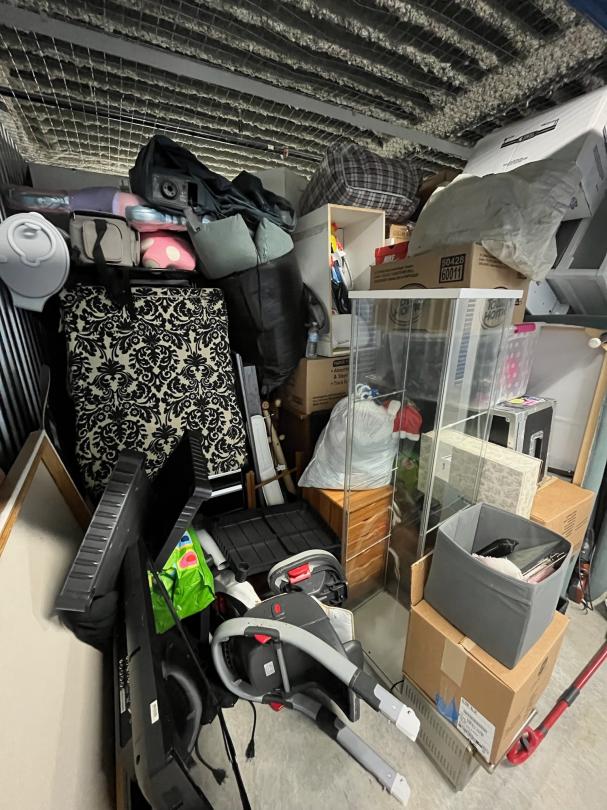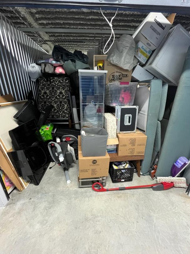 This unit appears to contain…Totes, case, bags, couch, boosterseat, misc items, bedrail, headboard, boxes