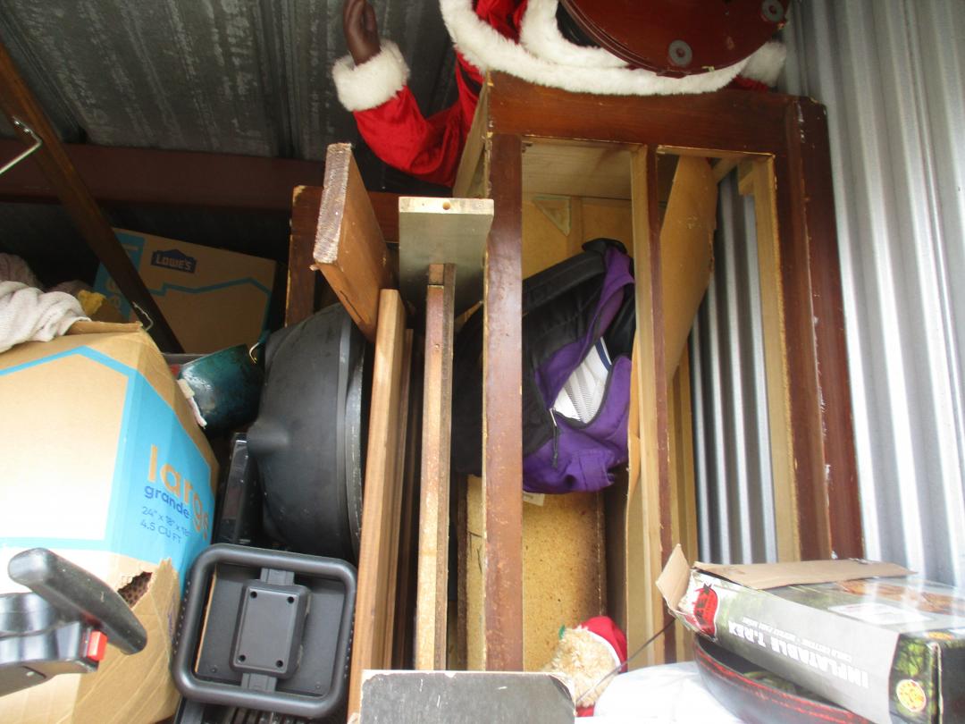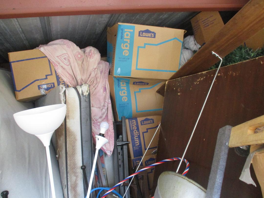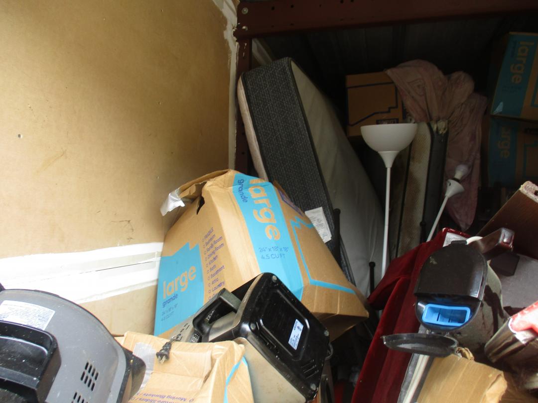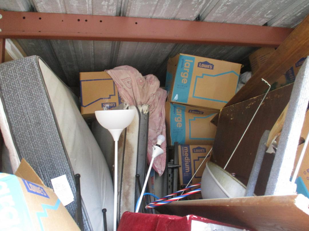 This unit appears to contain…Personal Property, tv, microwave, chairs, carpet cleaner, boxes, totes, mattress, box spring, lamps, Christmas decor, household furn, kitchen items, tables