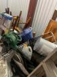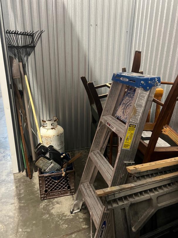 This unit appears to contain…Propane tank, saw horses, ladders, chairs. yard tools, wooden table, leaf blower, etc