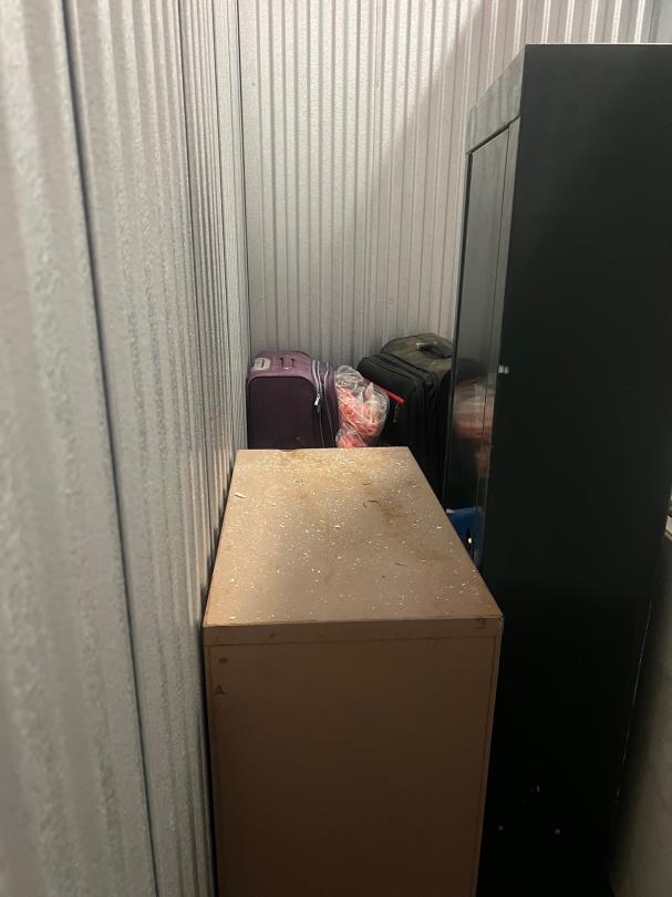 This unit appears to contain…Gun safe, foldable tables, fishing equipment, filing cbainet, suitcases, etc