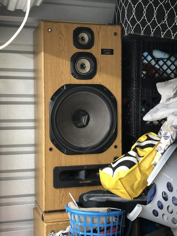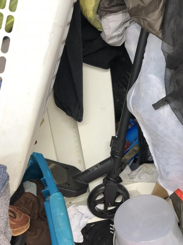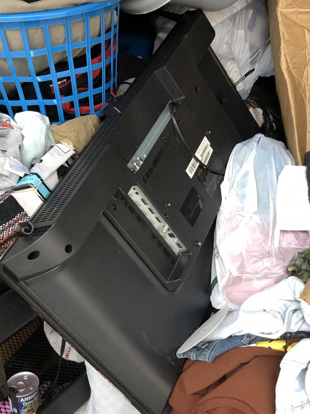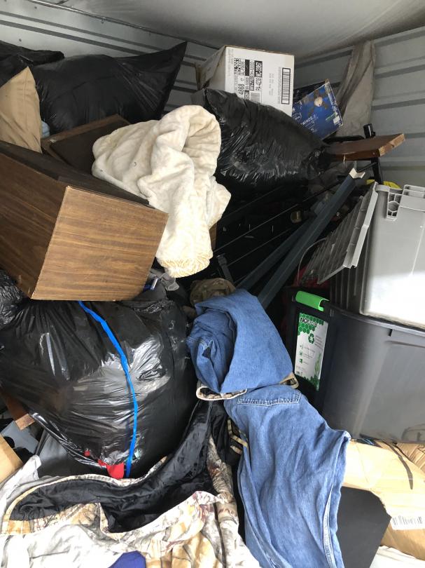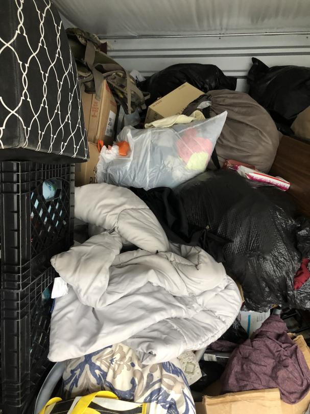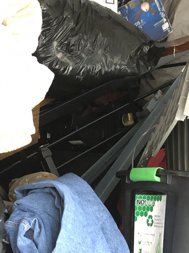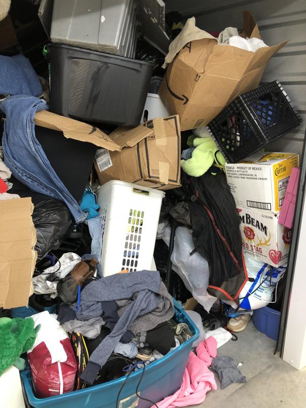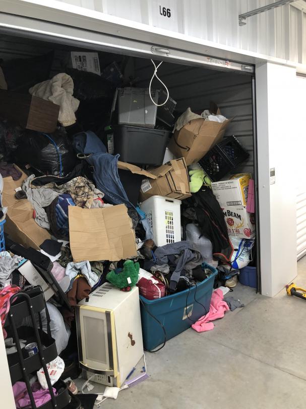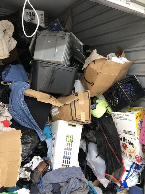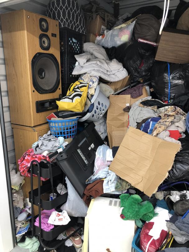 This unit appears to contain…Clothes, speakers, microwave, TV, containers, boxes, scooter, comforter