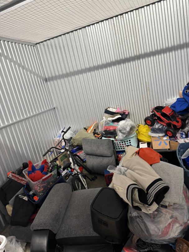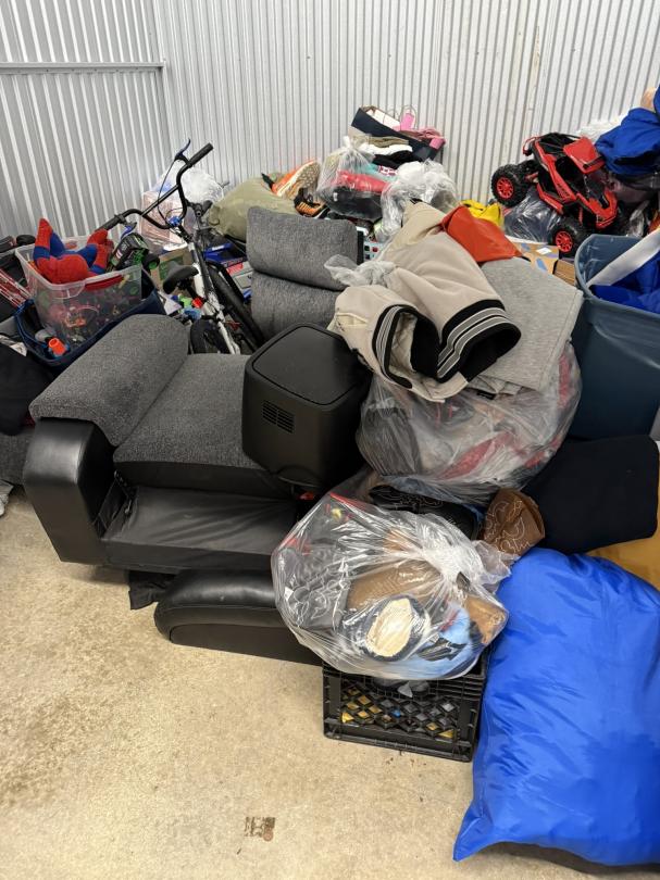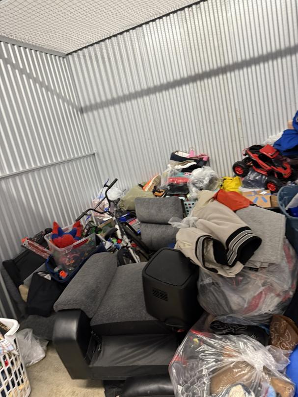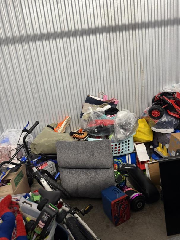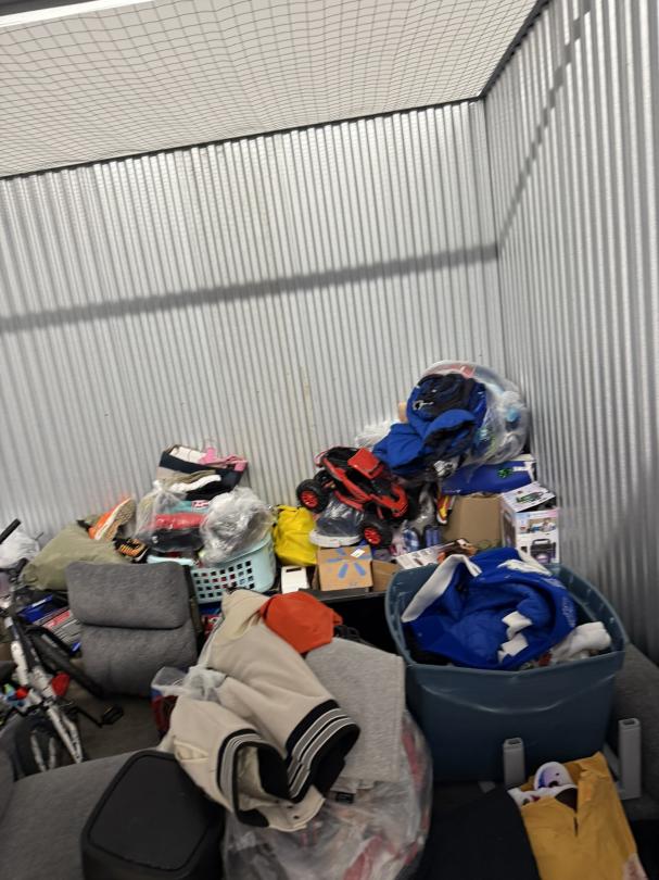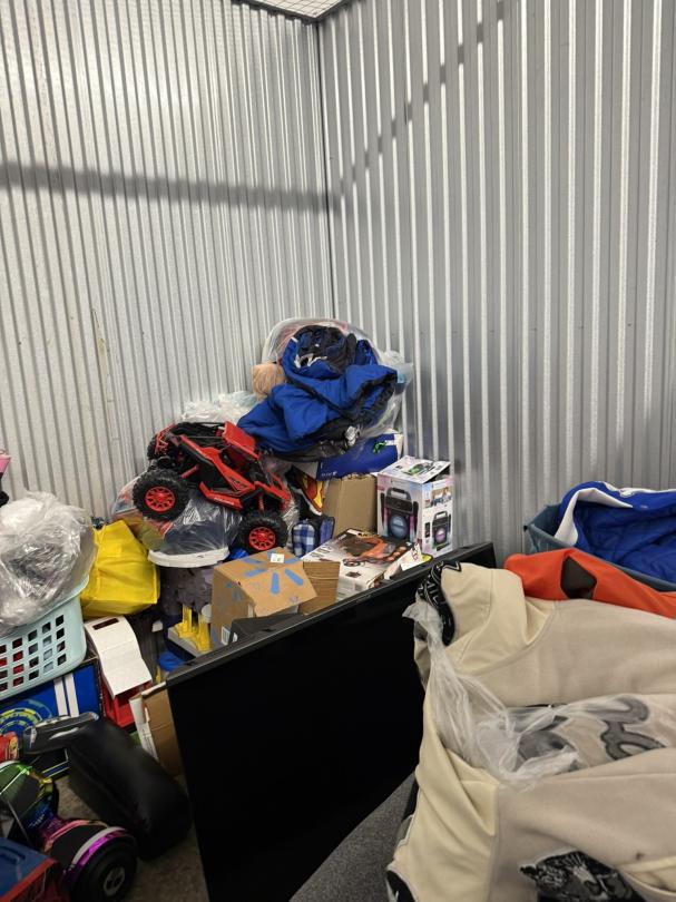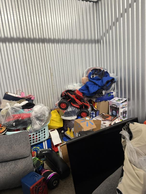 This unit appears to contain…TV, Couch, Baskets, Clothing, Toys, Shoes, Boxes, Kid Bikes, Tote, Hover Board, and Drone