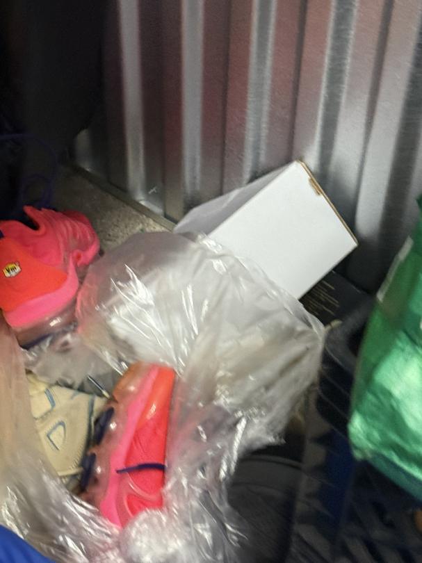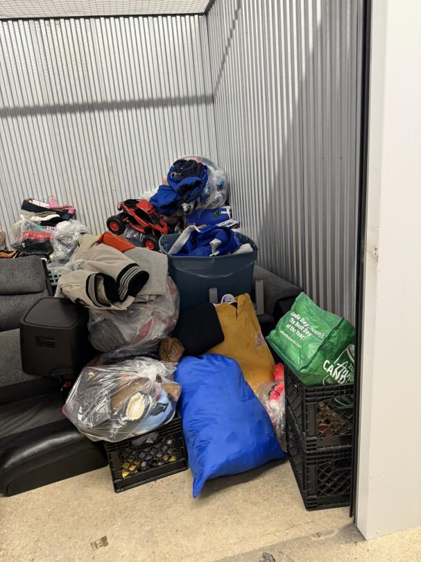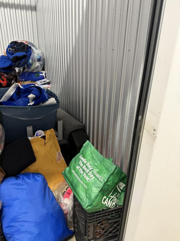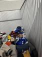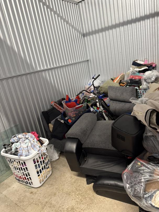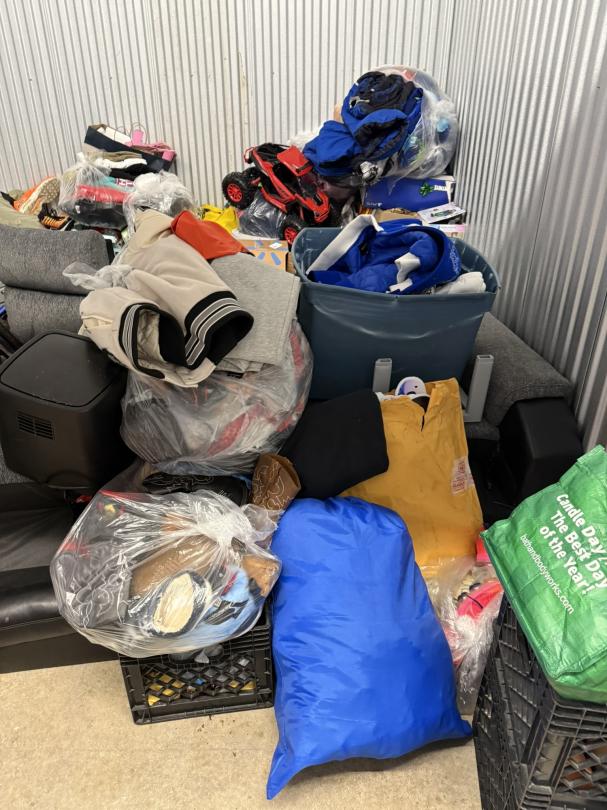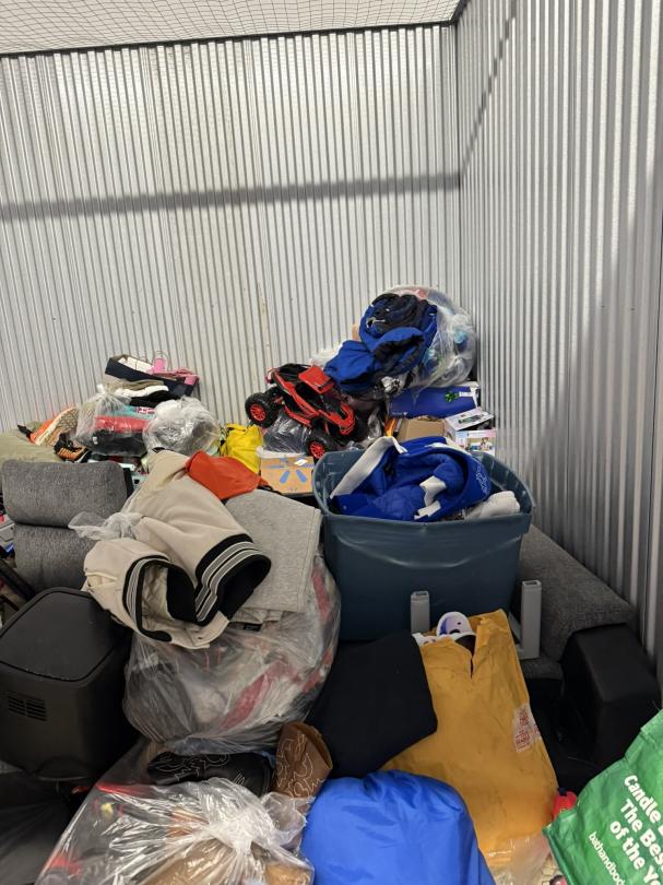 This unit appears to contain…TV, Couch, Baskets, Clothing, Toys, Shoes, Boxes, Kid Bikes, Tote, Hover Board, and Drone