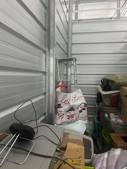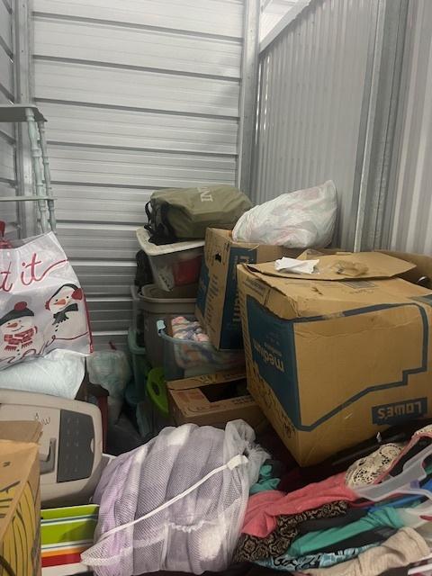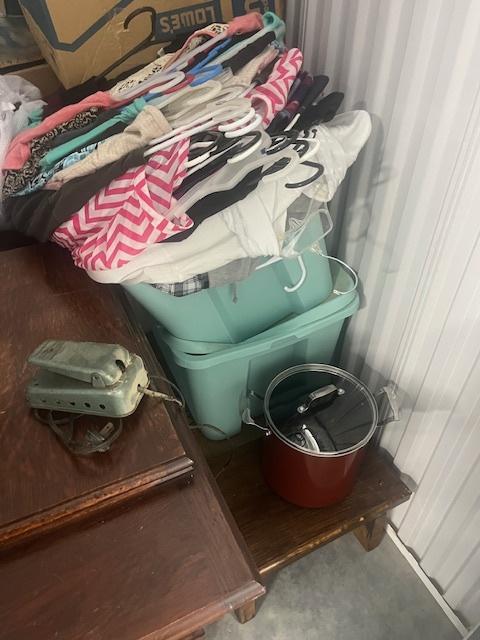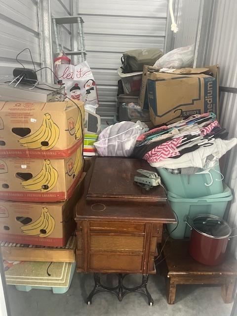 This unit appears to contain…Climate Controlled, Ground Floor, Indoor Access Sewing Table, Totes, Boxes, Clothes, Misc Household Items