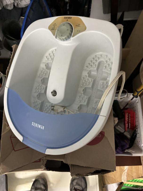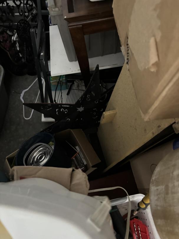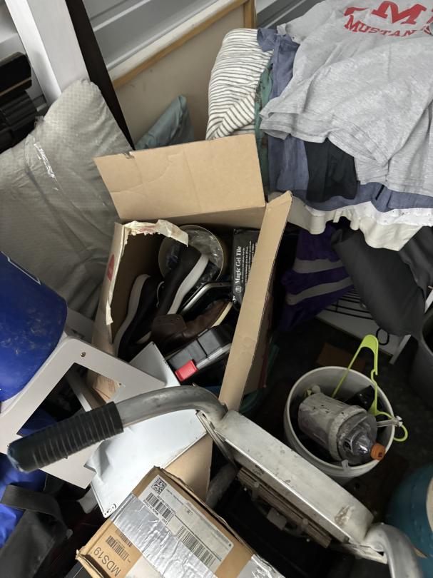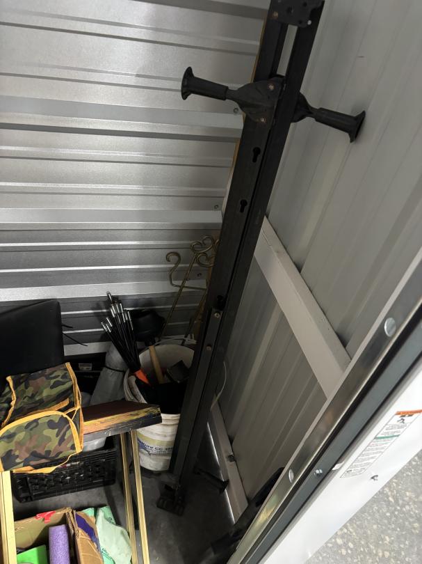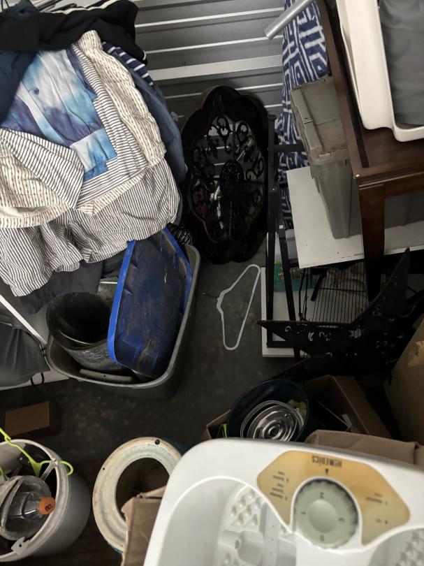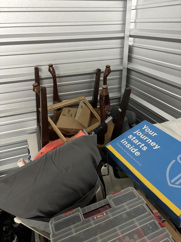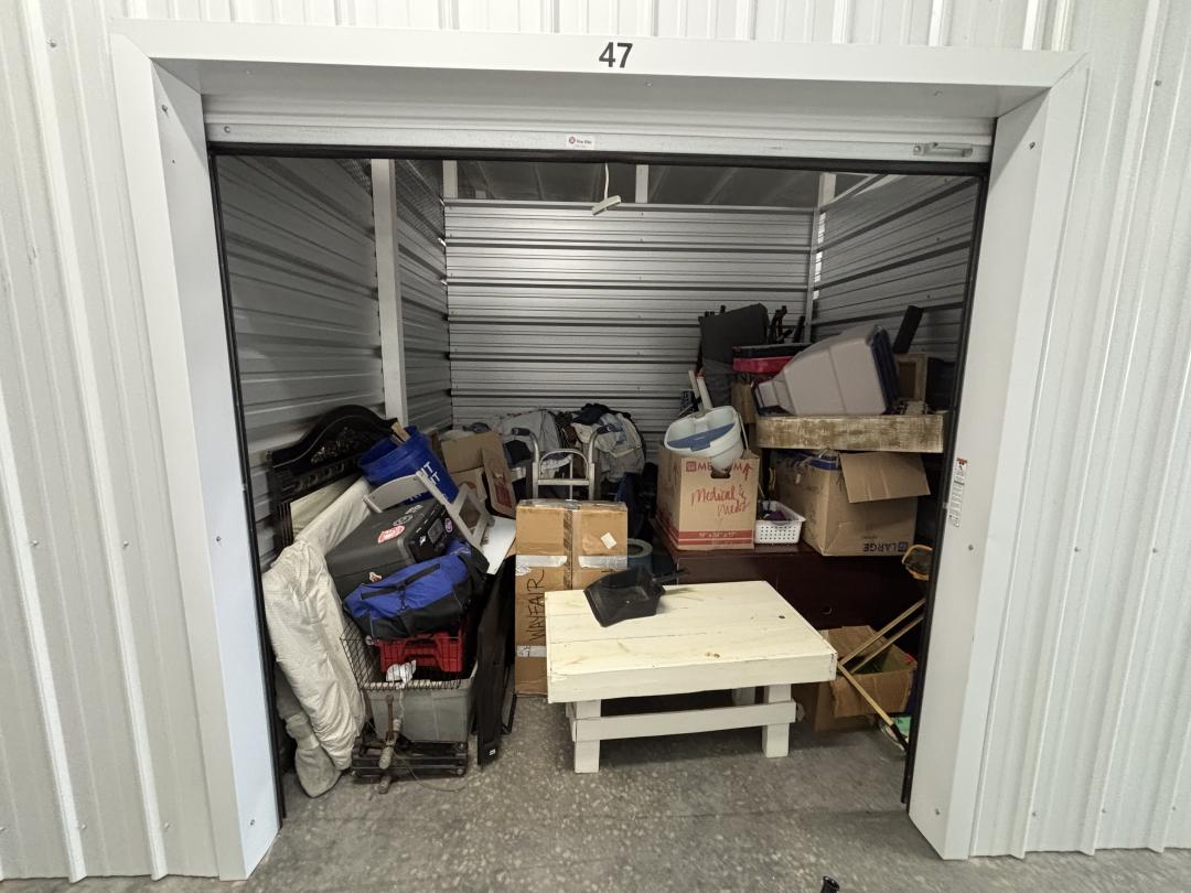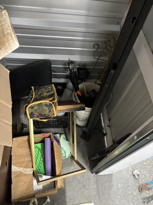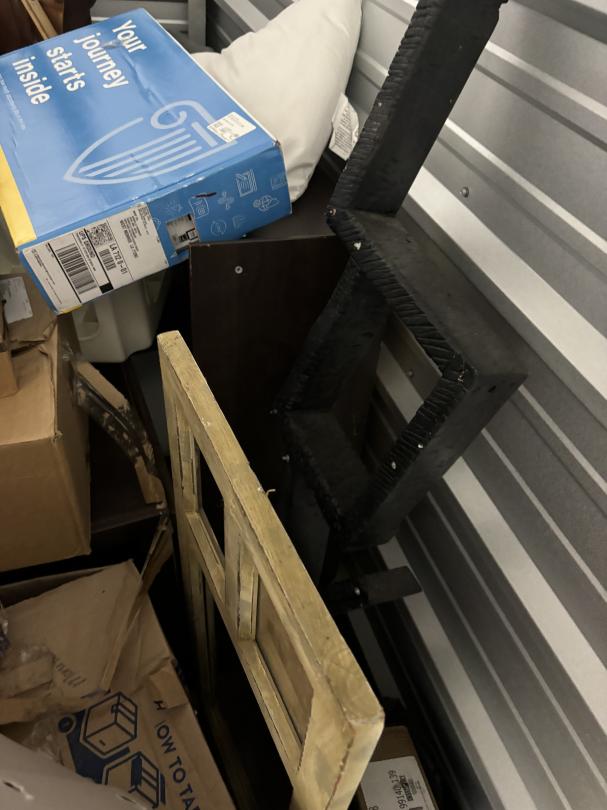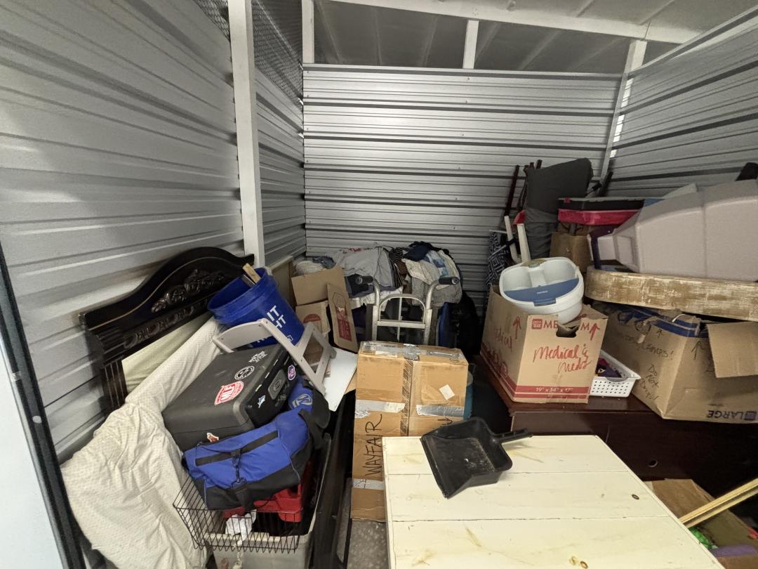 This unit appears to contain…Nice looking bed, mirror, maybe dresser to match, unopened safe, dolly, clothes and other household items