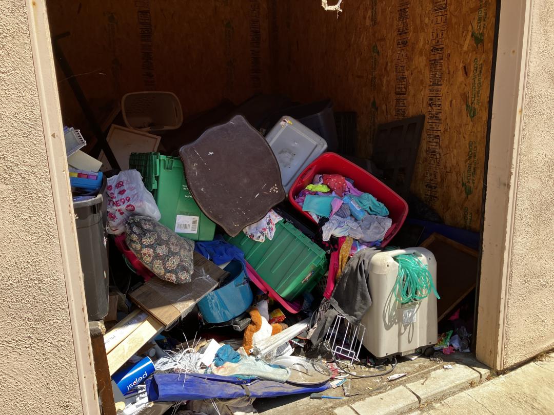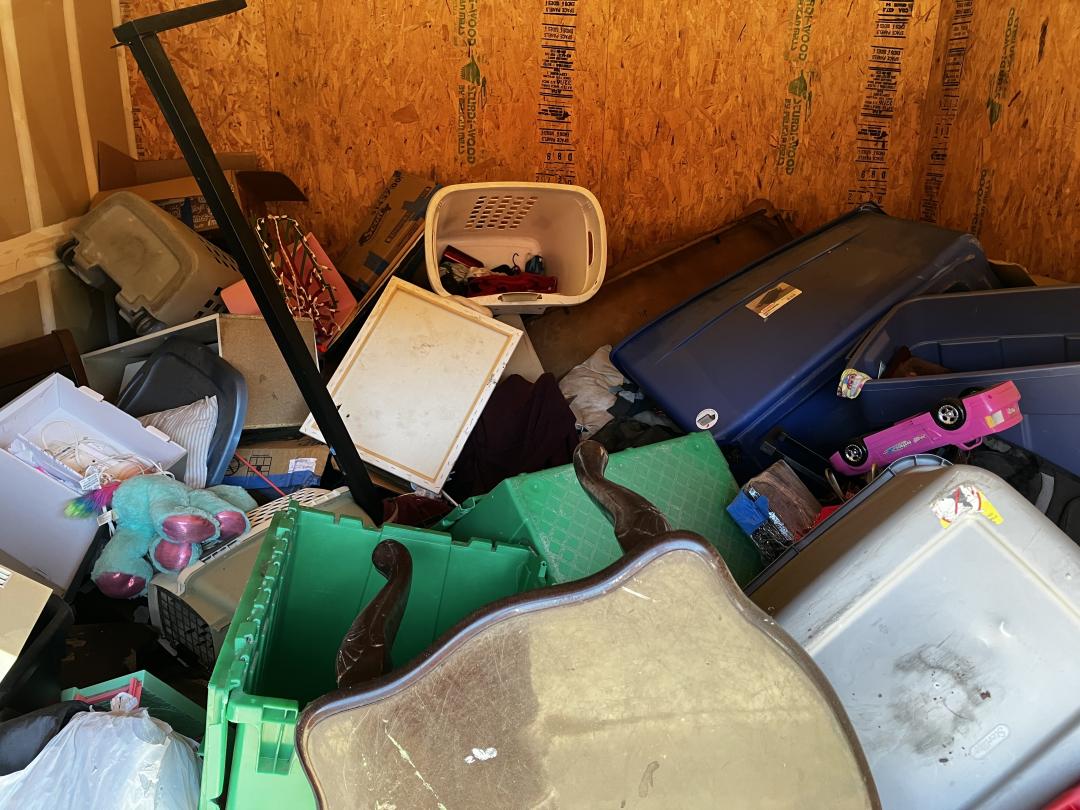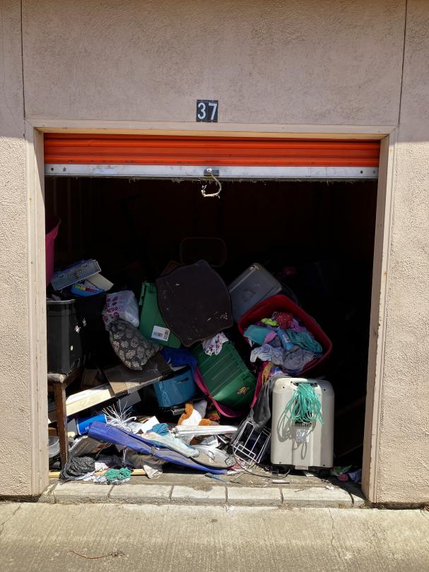 This unit appears to contain…a pile of clothes, bins, luggage and miscellaneous items