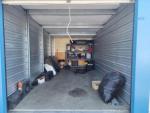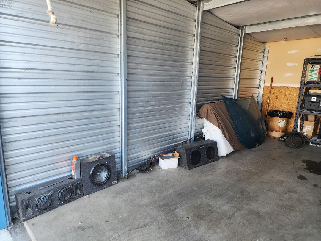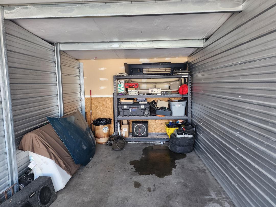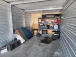 This unit appears to contain…Car parts, metal shelving, toolbox, tires, car jack, car hood, mattress, pillow, speakers, shovel, tote, stereo, garage items