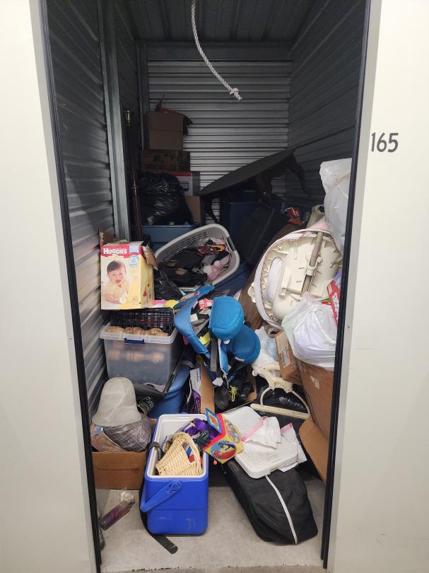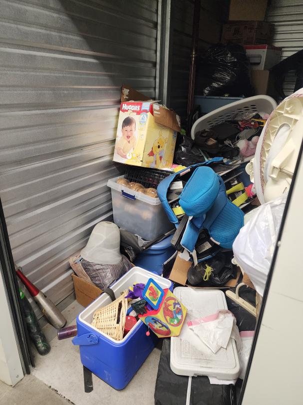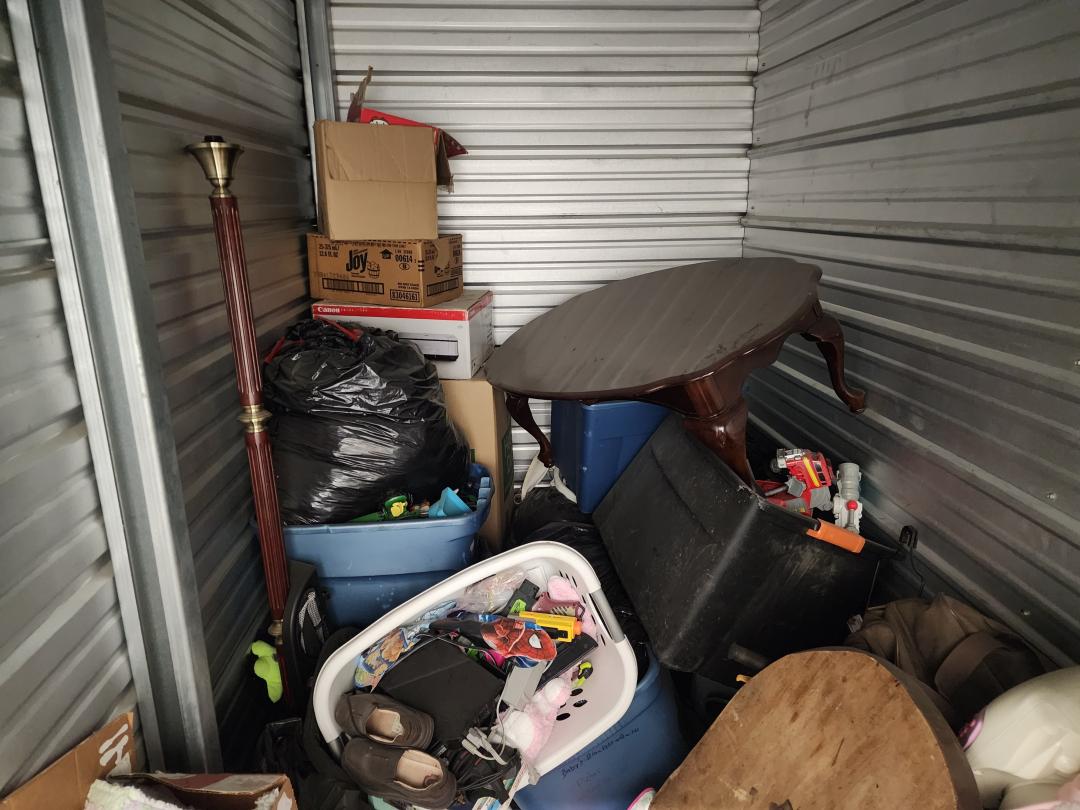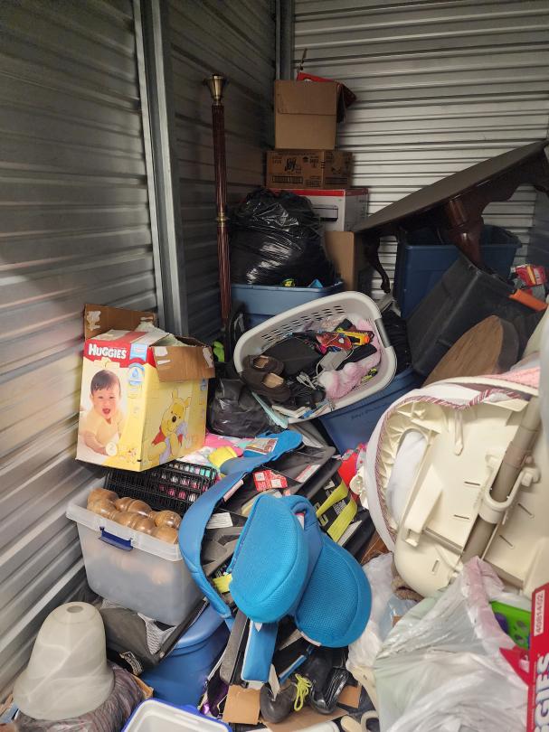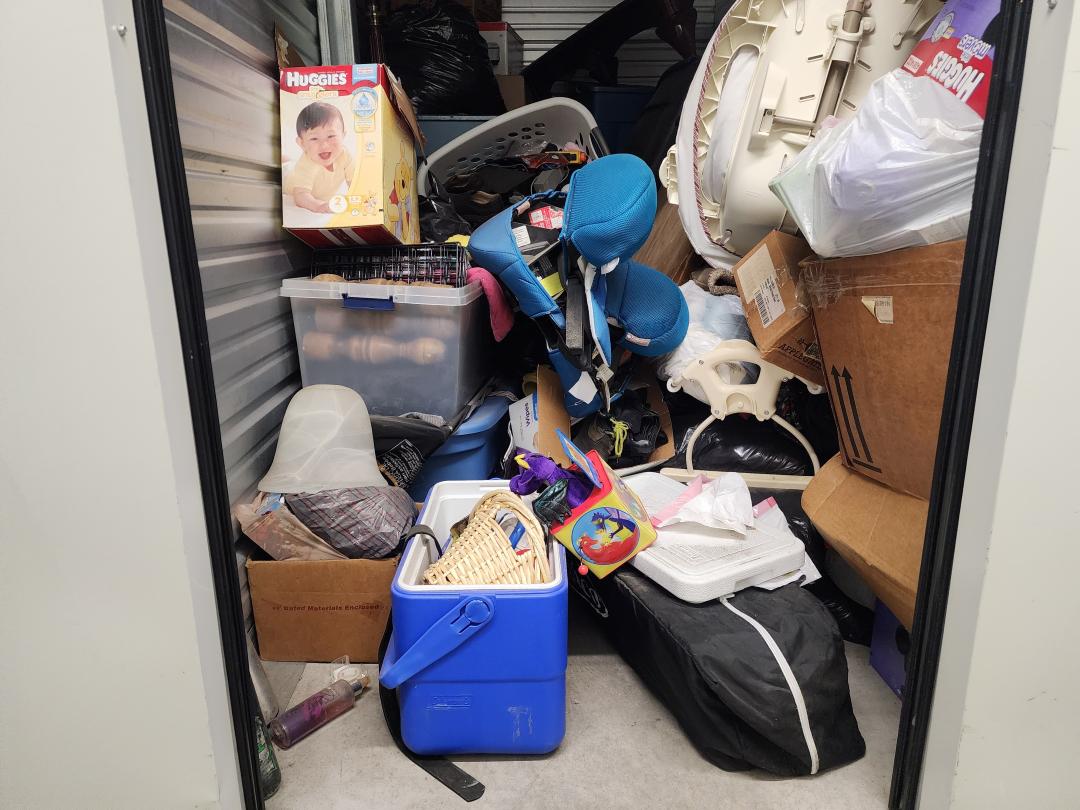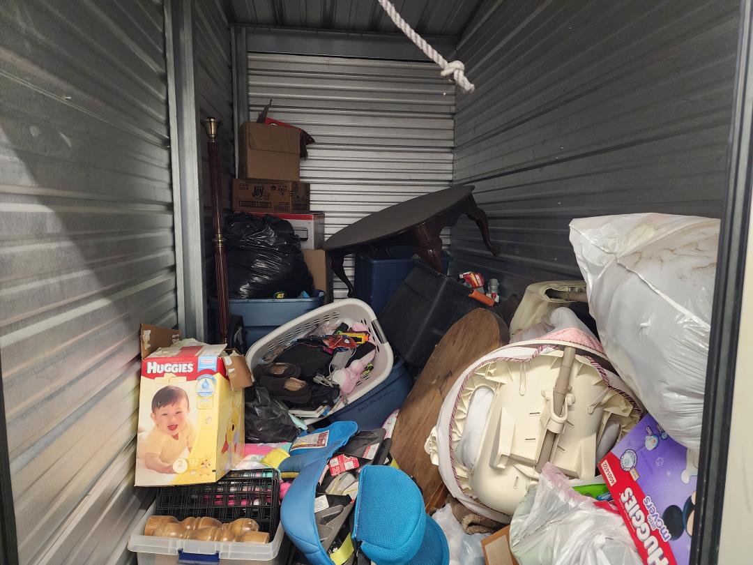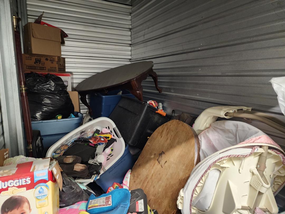 This unit appears to contain…Bags, cooler, toys, car seat, baby swing, boxes, coffee table, laundry basket, H/H, lamp shade & stand, bags, baseball bats, pack n play, clothing & shoes, blanket, totes