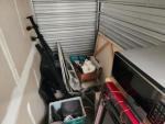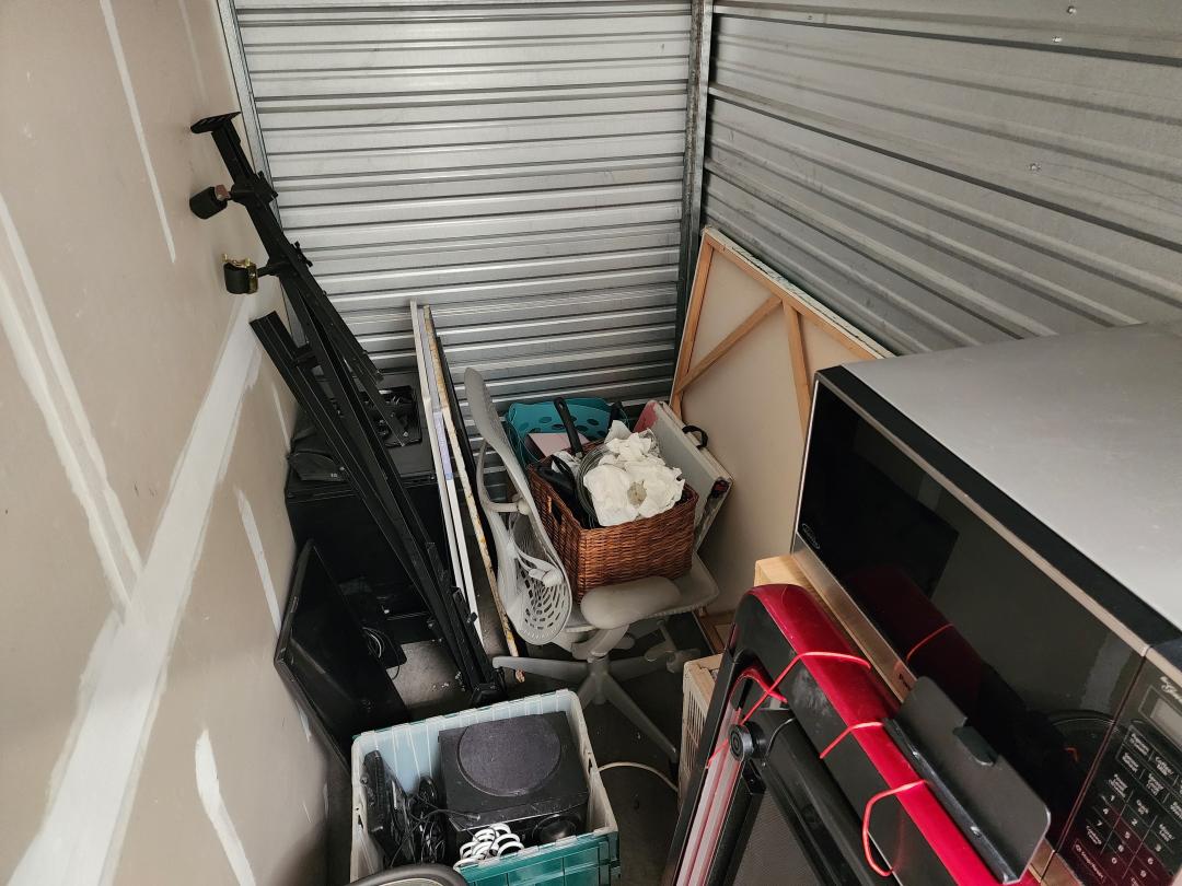 This unit appears to contain…Treadmill, microwave, cabinets, wall art, crockpot, box, extension cord, chain, speaker, box, electronics, bedframe, TV, office chair