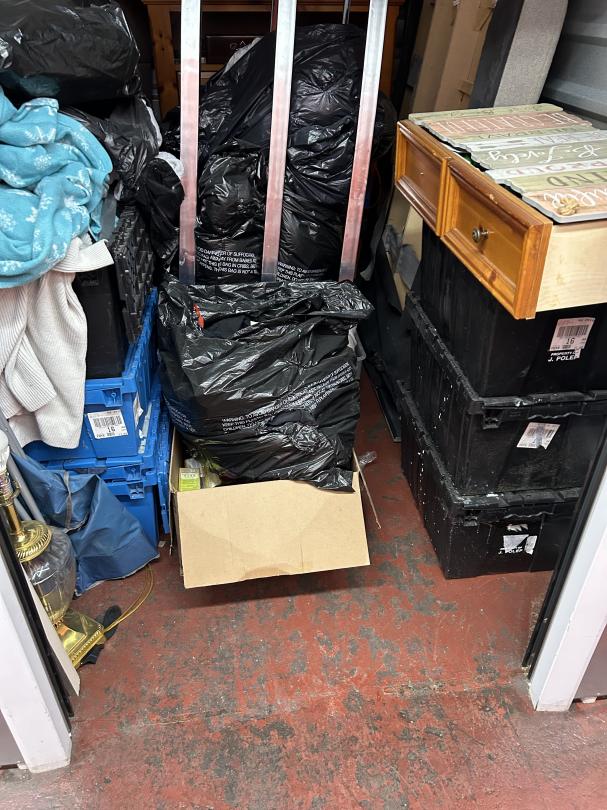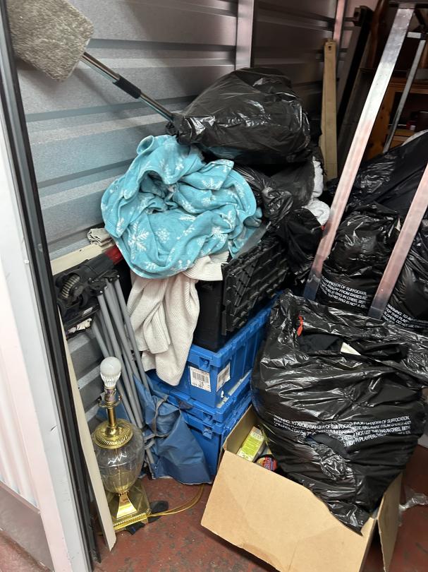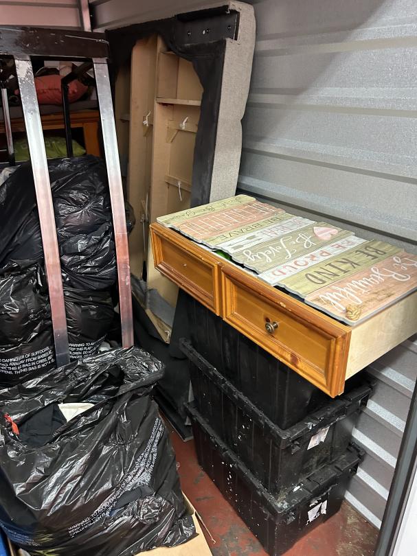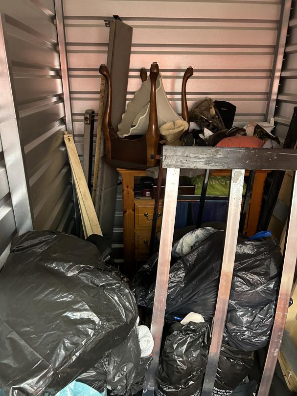 This unit appears to contain…READ ALL AUCTION RULES BEFORE BIDDING!!! Unit appears to contain: totes, dresser, table, lamp, folding chair, vacuum, clothes