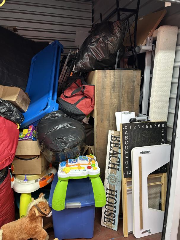 This unit appears to contain…READ ALL AUCTION RULES BEFORE BIDDING!!! Unit appears to contain: toys, backpack, bed frames, tables, totes, mattress, laundry basket, rocking horse