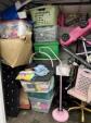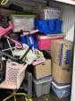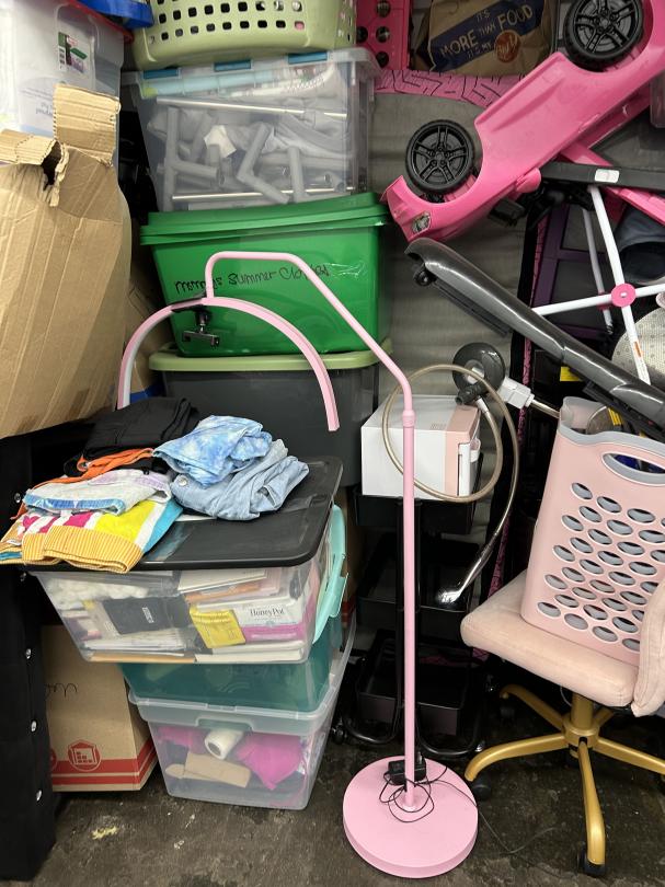 This unit appears to contain…READ ALL AUCTION RULES BEFORE BIDDING!!! Unit appears to contain: bed frame, lamp, chair, baby activity center, step stool, boxes, totes, laundry basket, bags, rolling rack