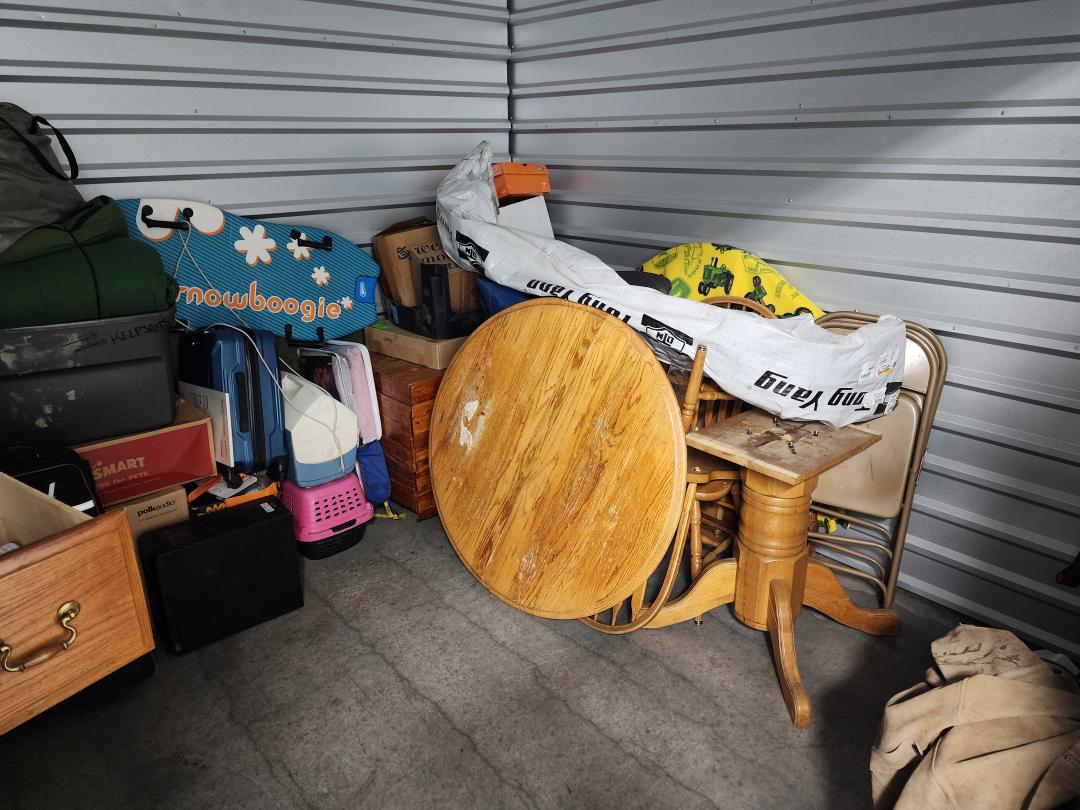 This unit appears to contain…Table, Chairs, totes, clothes, welding leathers, work out equipment, car part, blanket, folding chairs, case, animal crate, lunch box, suitcase, chest, boxes, dresser, sleeping bag, bag, PC
