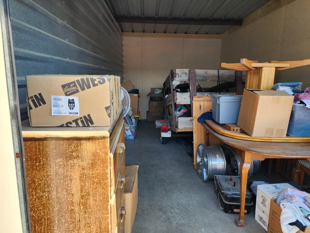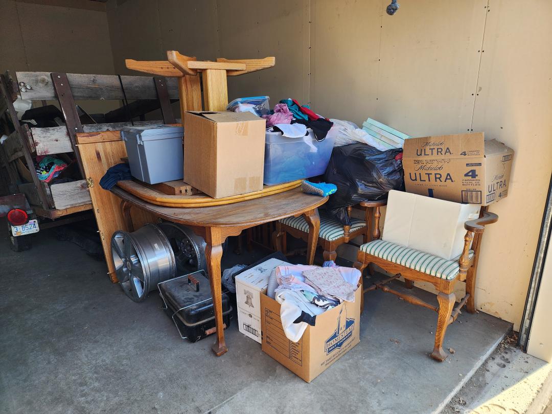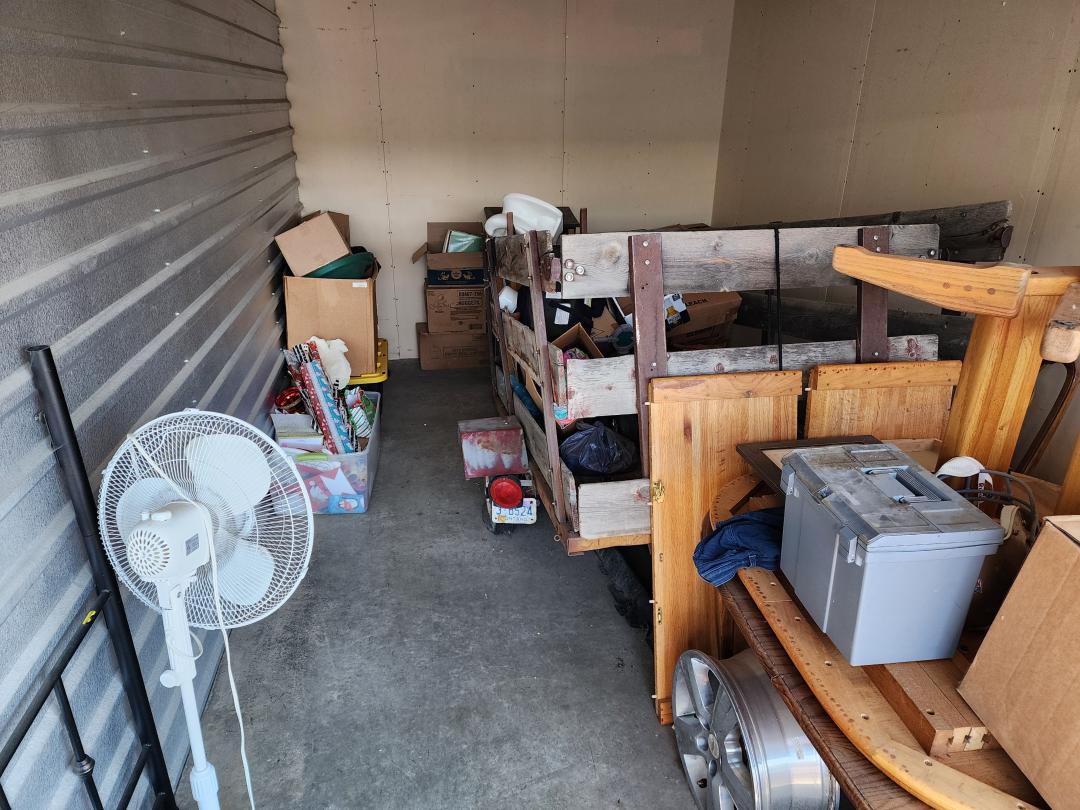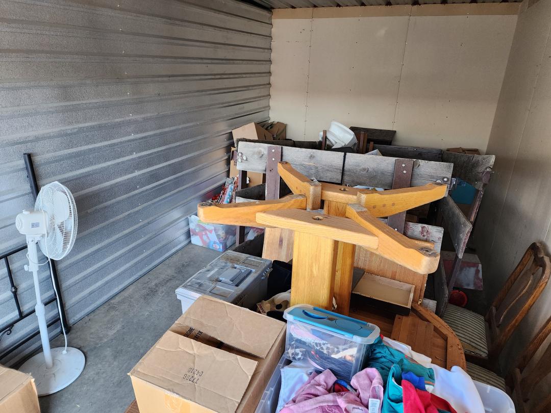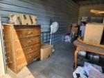 This unit appears to contain…Chairs, table, boxes, clothes, bags, wall art, totes, propane bbq, rims, trailer, file, dresser, fan, Christmas items, animal crate