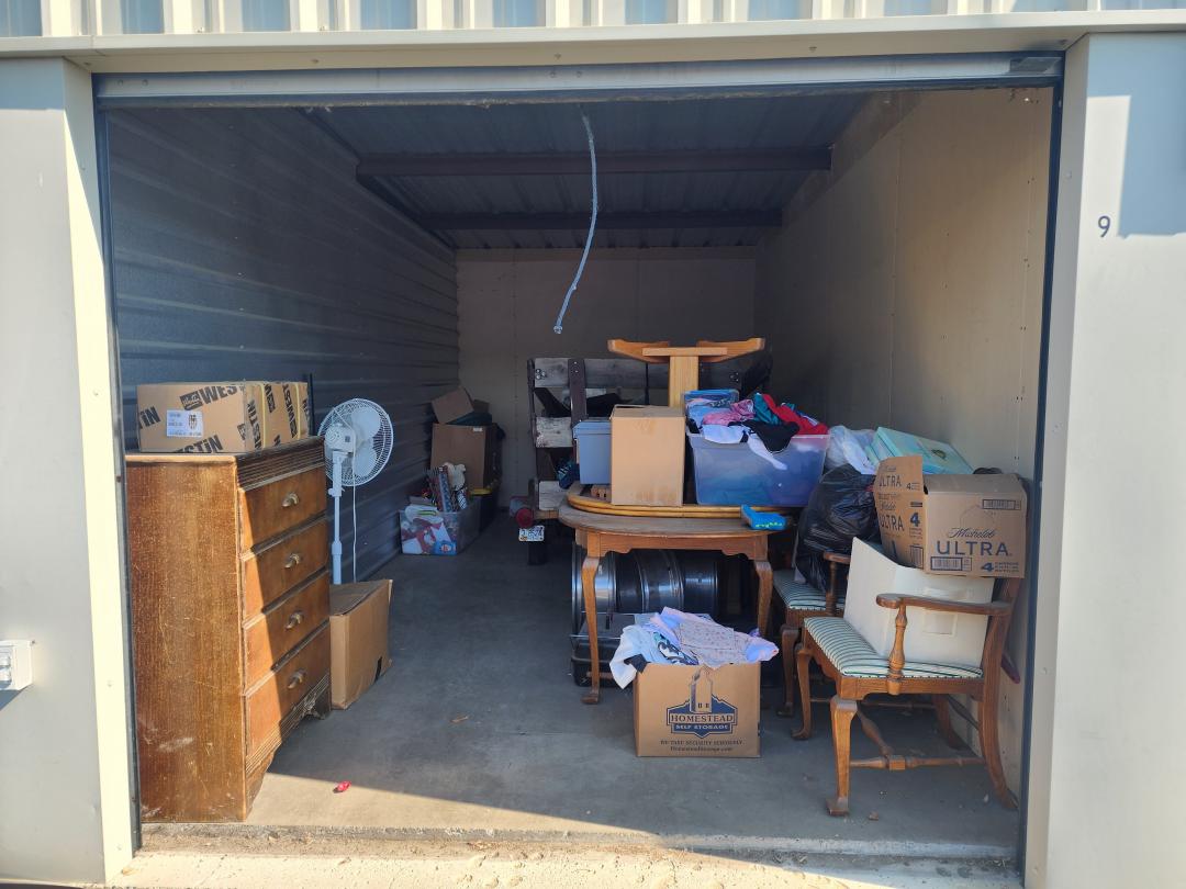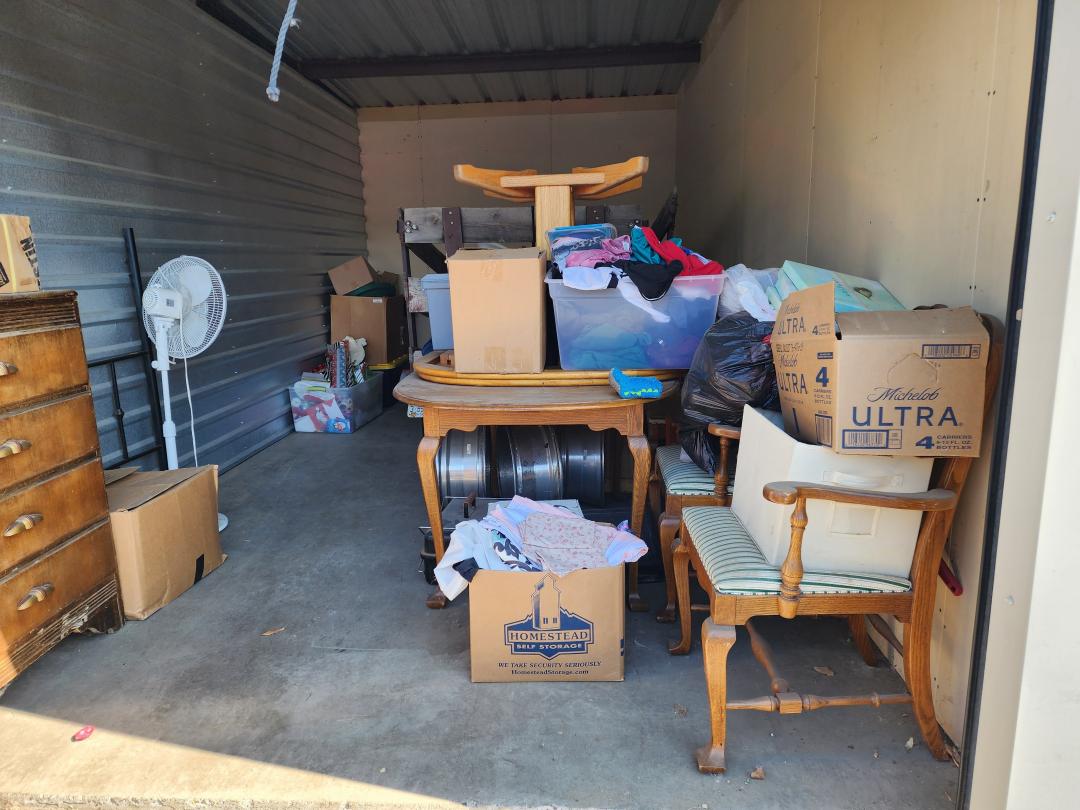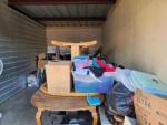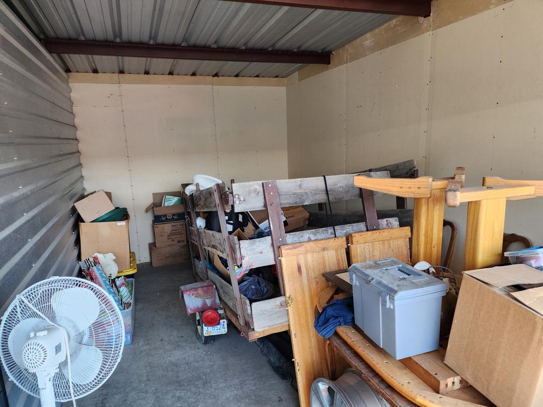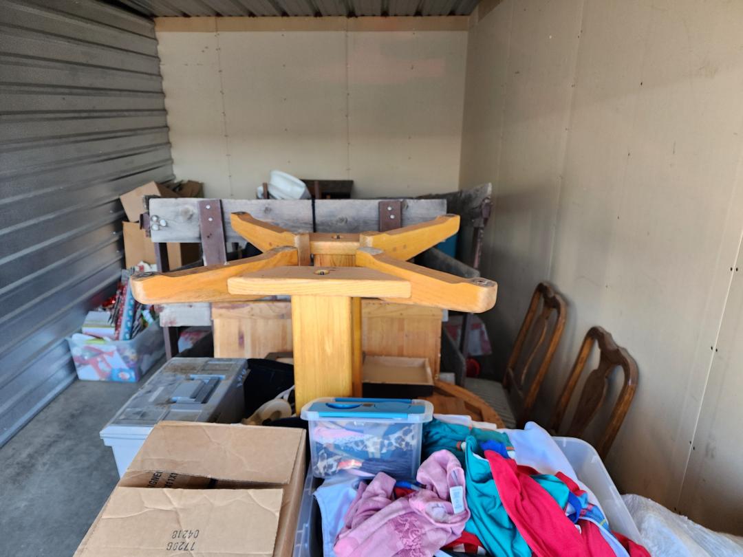 This unit appears to contain…Chairs, table, boxes, clothes, bags, wall art, totes, propane bbq, rims, trailer, file, dresser, fan, Christmas items, animal crate