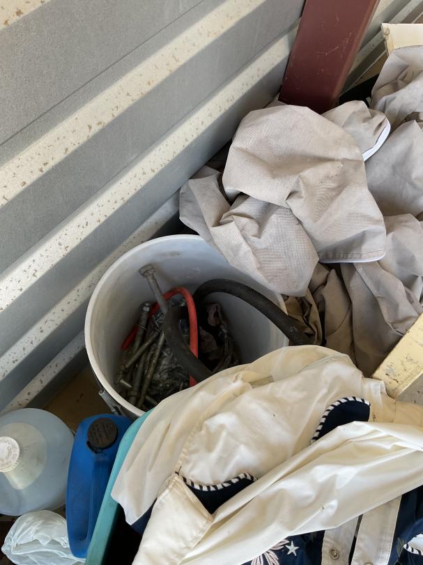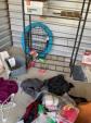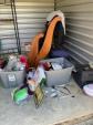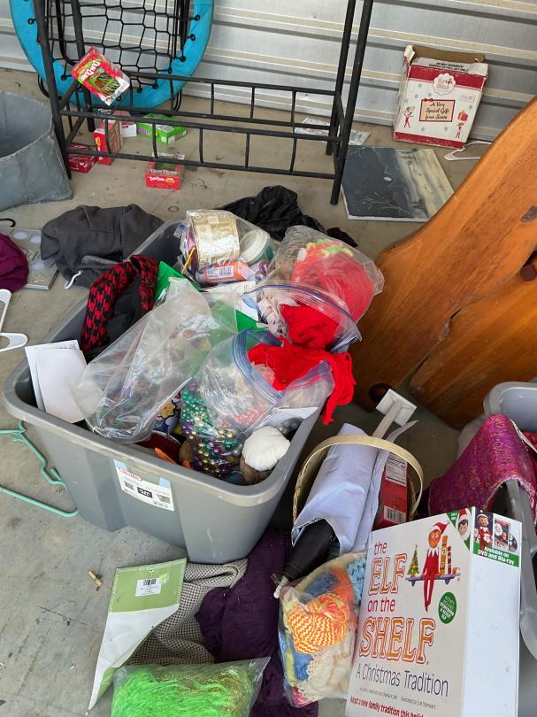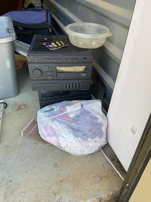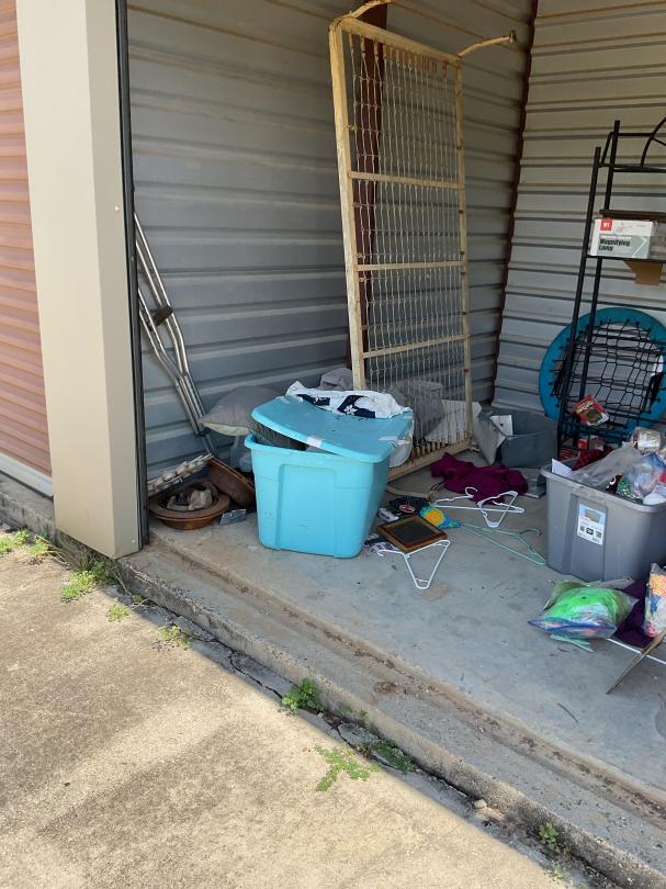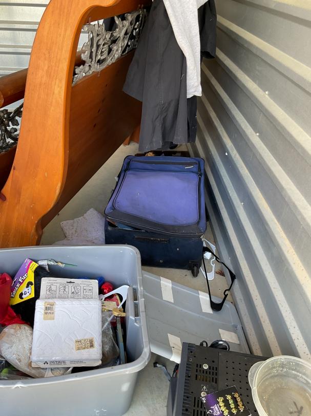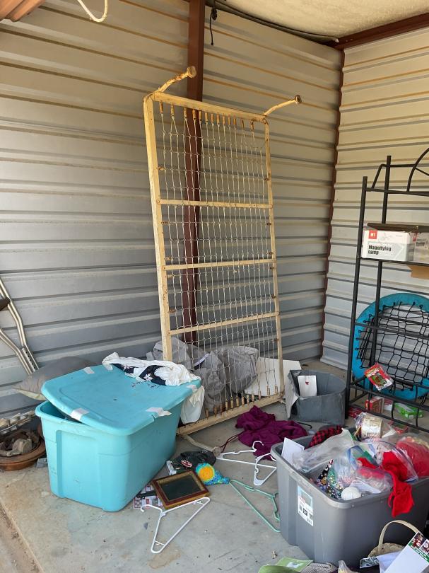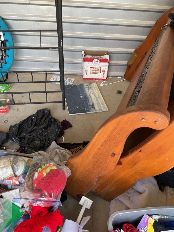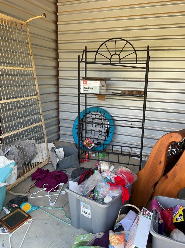 This unit appears to contain…This unit appears to have a Benjie chair, paintings, a shelf, decor, possible rotors, crutches, a mirror, a stereo, yarn, hoses, luggage, possible magnifying lamp, and Mardi gras items.