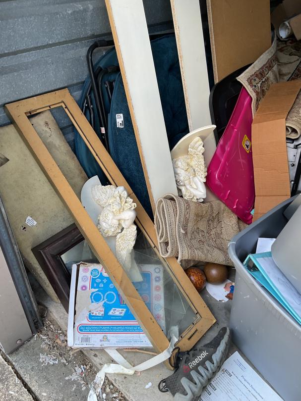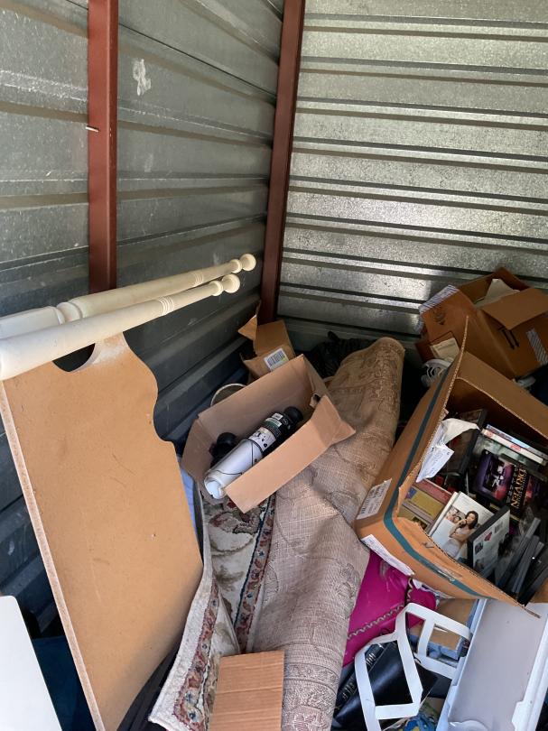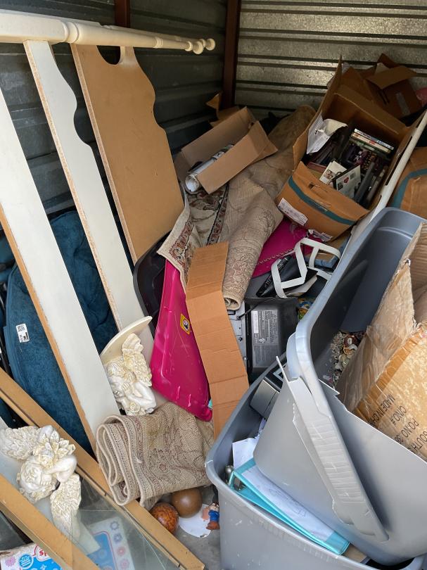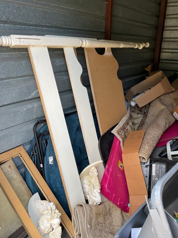 This unit appears to contain…This unit appears to have a rug, a head board, DVD box, computer parts, a Saucer Chair, folding chairs, angel shelves, wall decor and toys