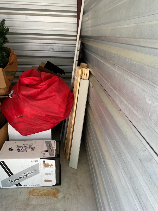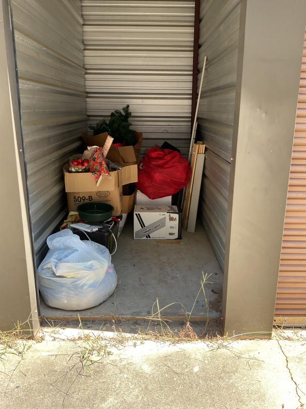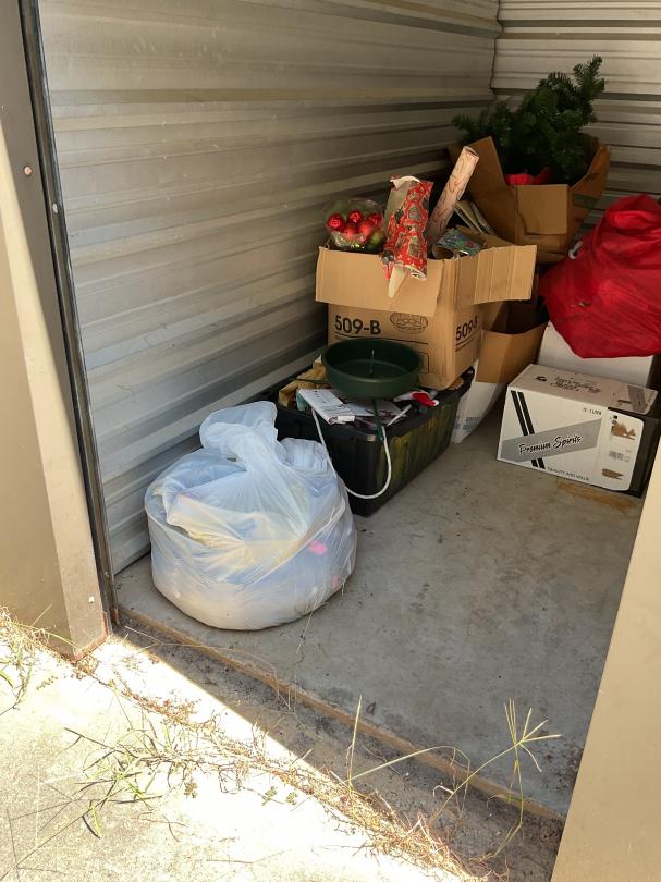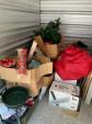 This unit appears to contain…This unit appears to have Christmas Decorations, a tree stand, wood slats, bags, boxes a bike helmet and a fish tank.