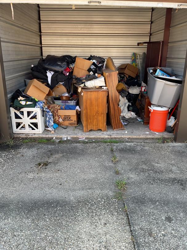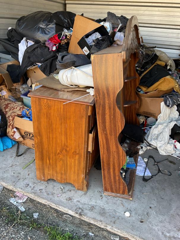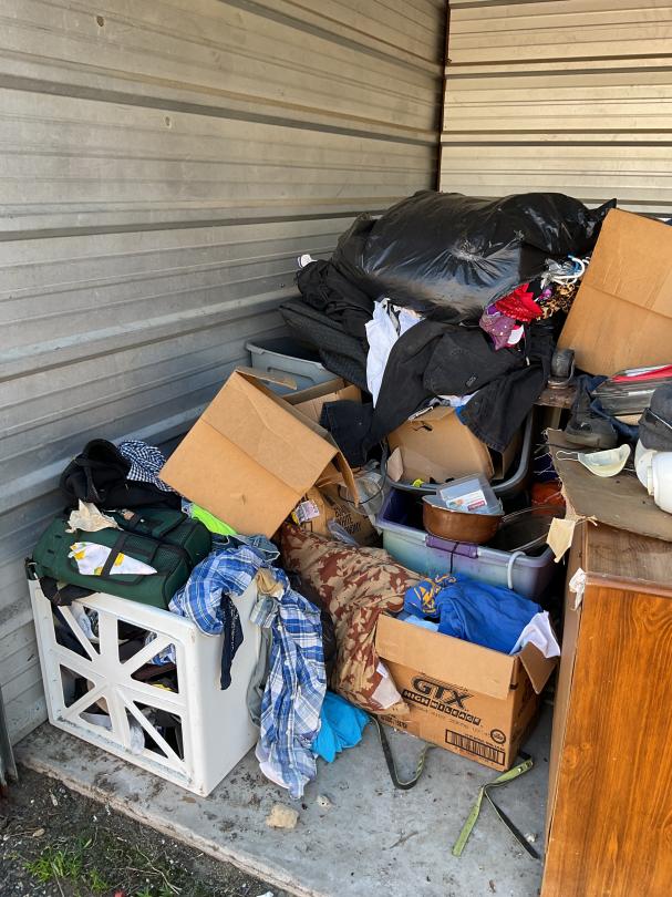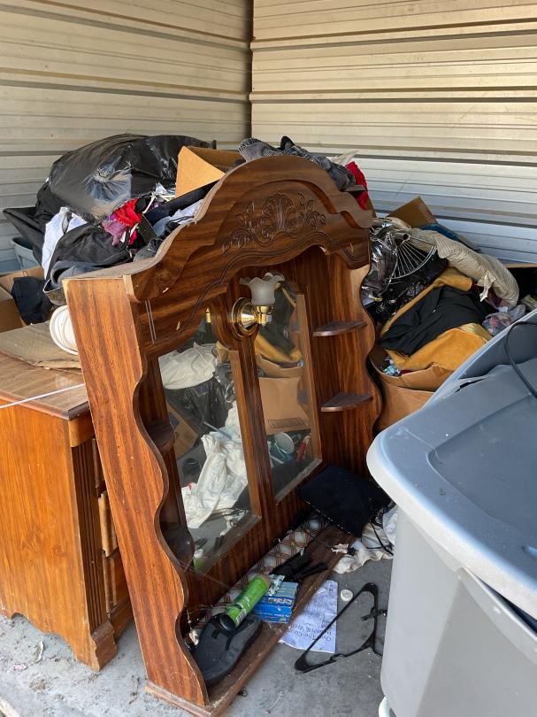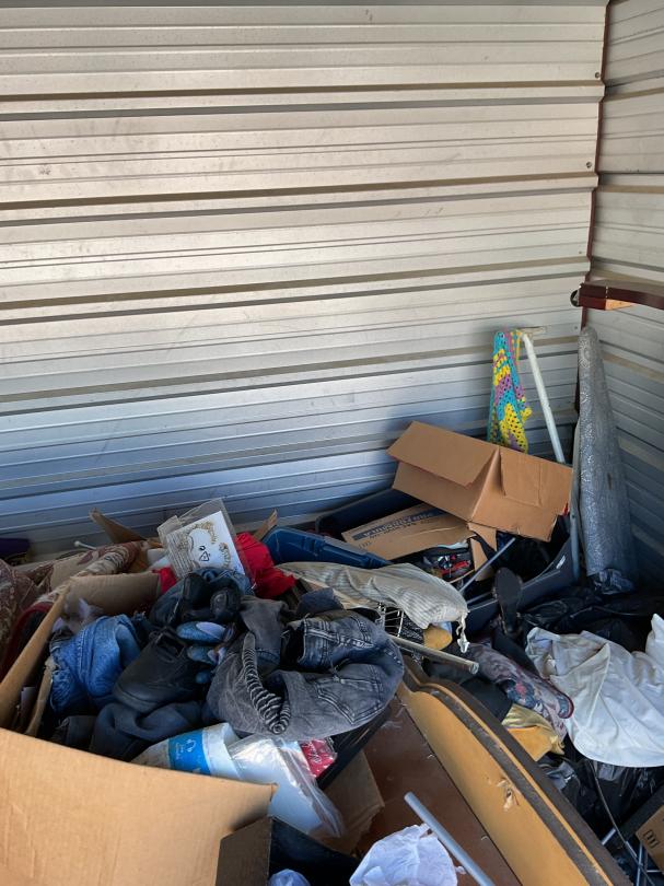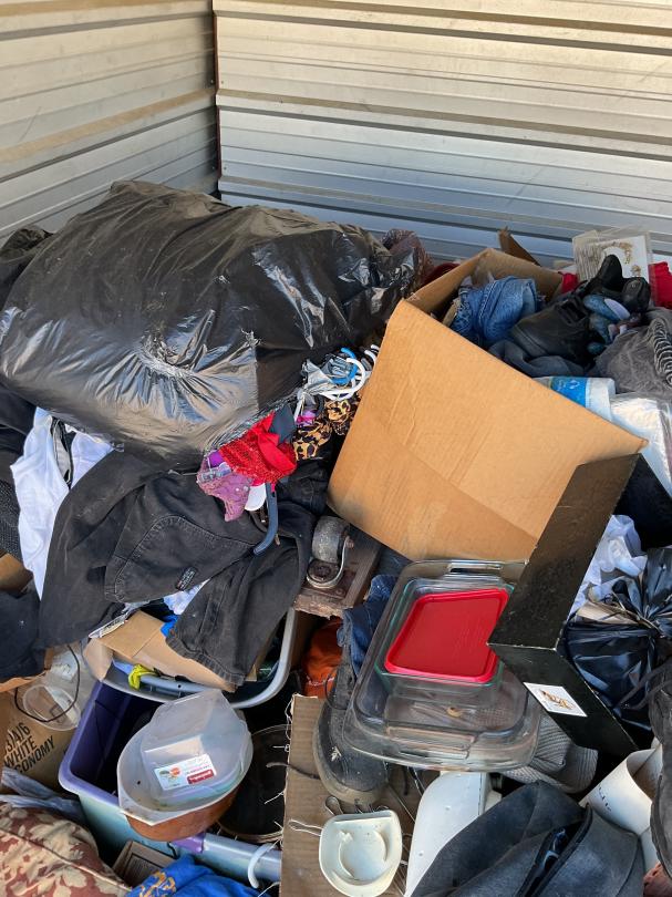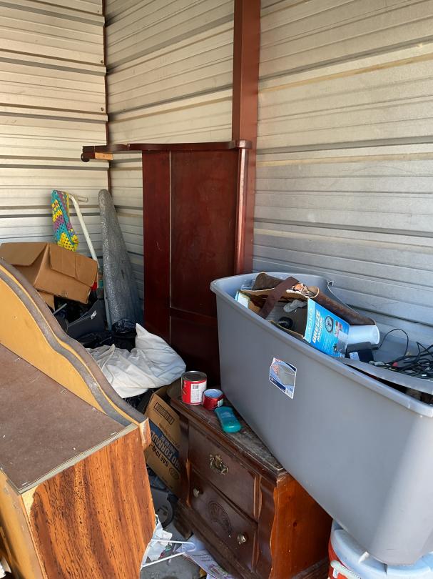 This unit appears to contain…This unit appears to have bags, totes, a dresser, a mantel, a small end dresser, a cooler, ironing board, mixer, a wine kit, clothes, a scope and a floor dolly.