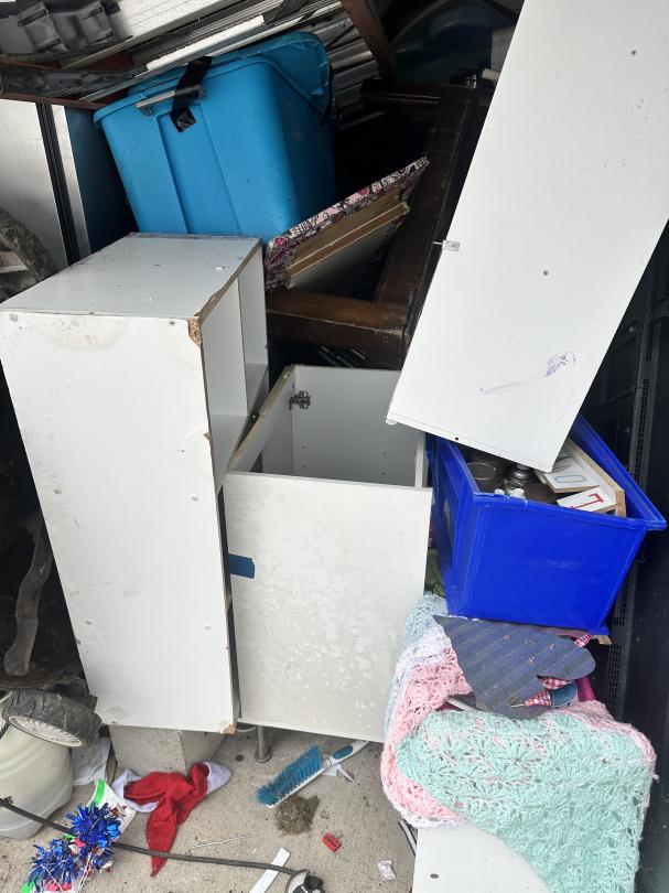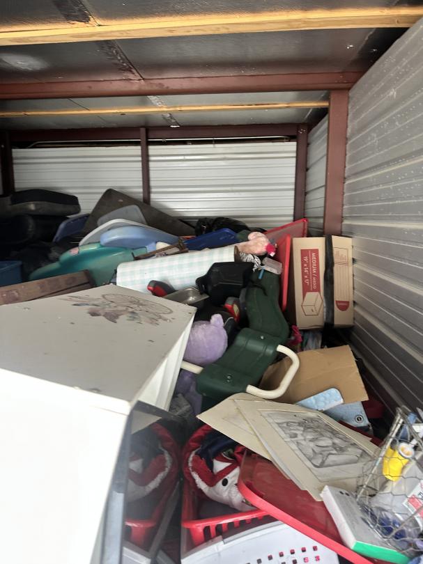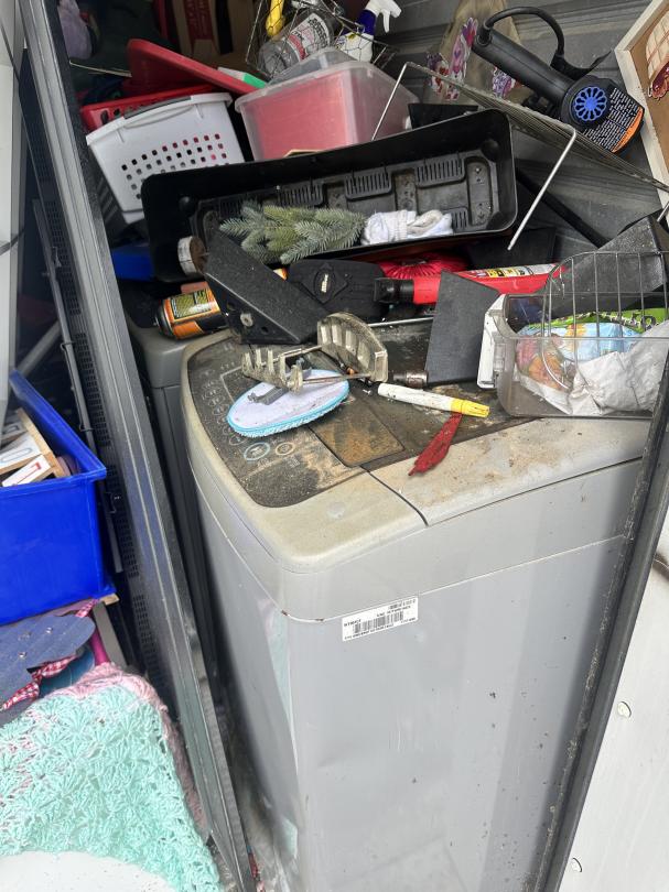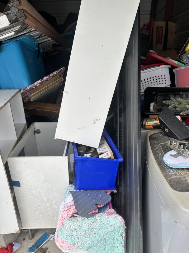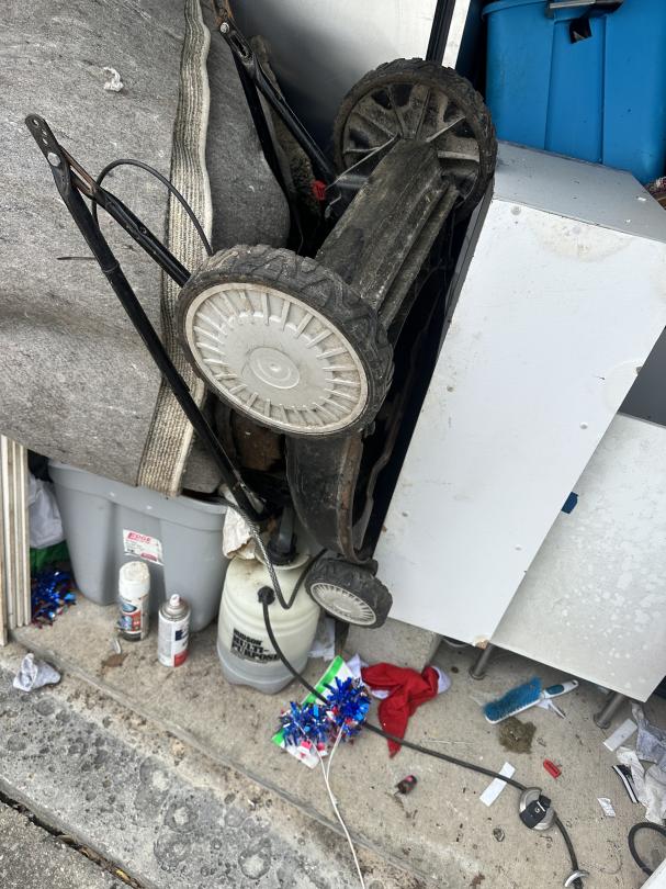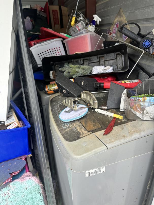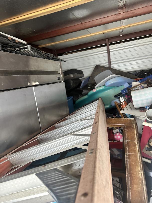 This unit appears to contain…Push mower, Cabinets, Washing Machine & Dryer, kids slide, commercial refrigerator or freezer