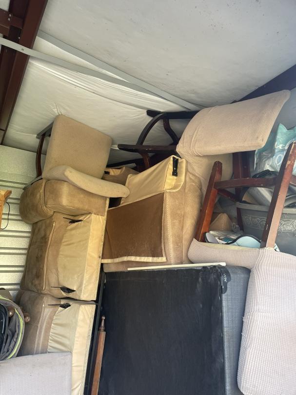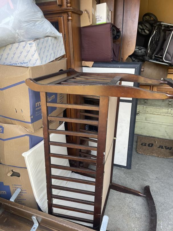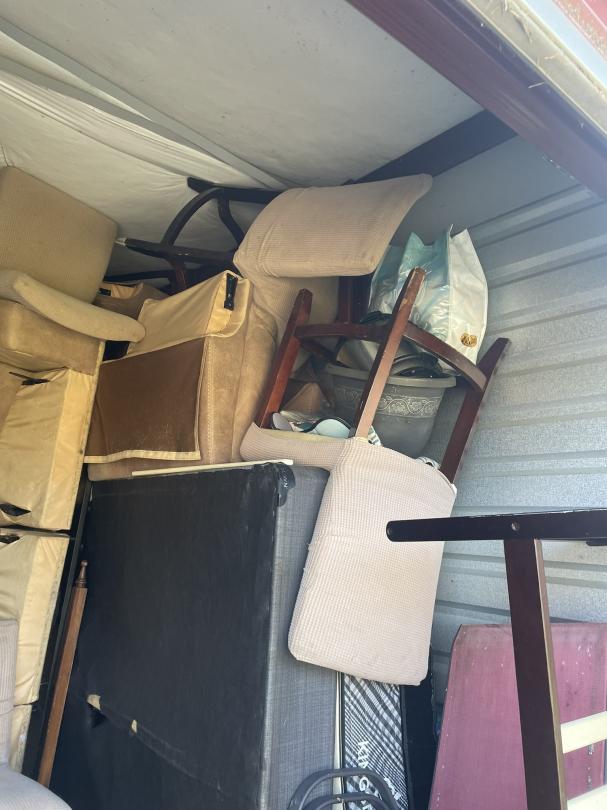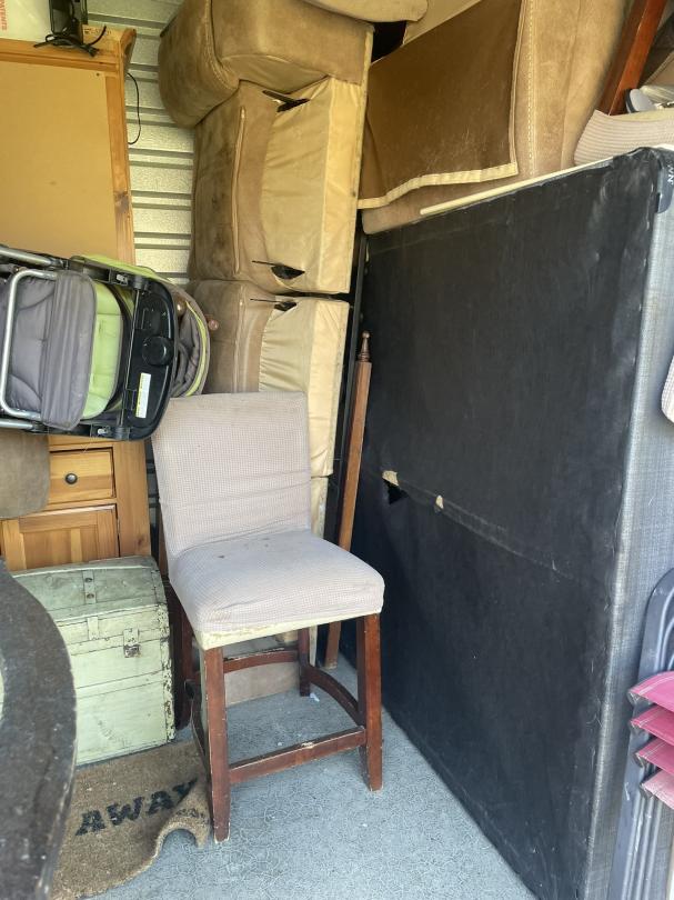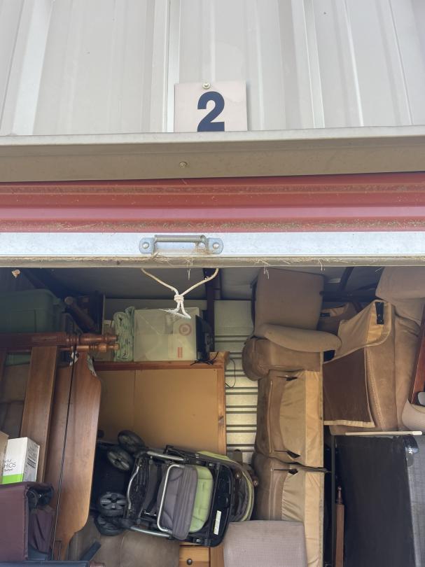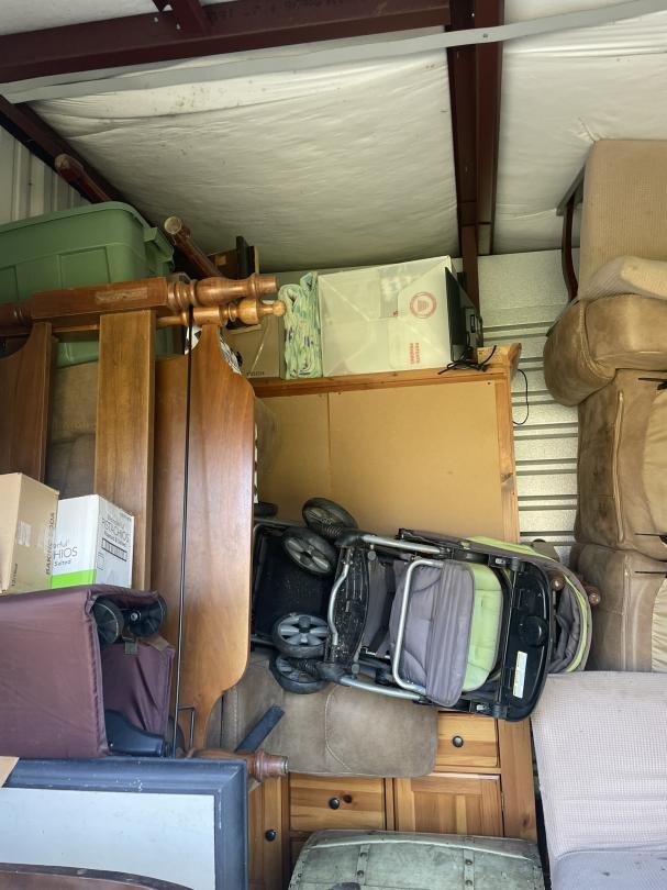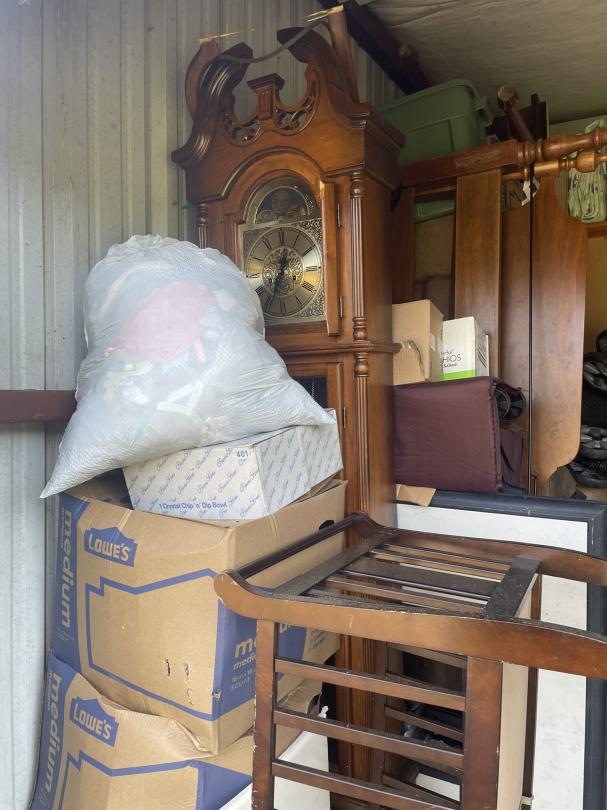 This unit appears to contain…Unit appears to contain: stroller, flat screen tv, couch, portable crib, mattresses, crib, grandfather clock, table, chairs, outside chairs, toddler bed, truck, and boxes.