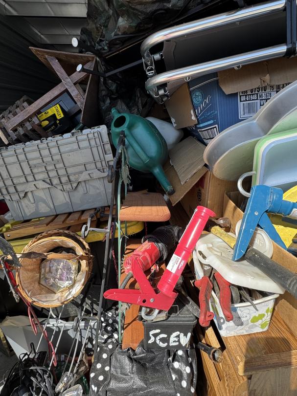 This unit appears to contain…Wall art, tools, mower, computer monitor, totes, home decor, furniture, totes, toys, Christmas decorations, mattresses, TV, rugs, and more.